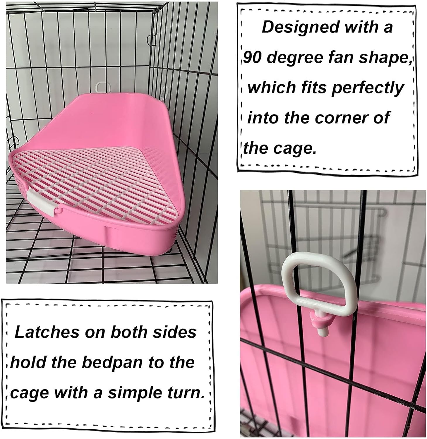 Easy to Install and Clean: Latches on both sides hold the litter pan to the cage with a simple turn. Plastic floor mesh is larger, waste can easily pass through. When the box needs cleaning, gently remove and rinse with water