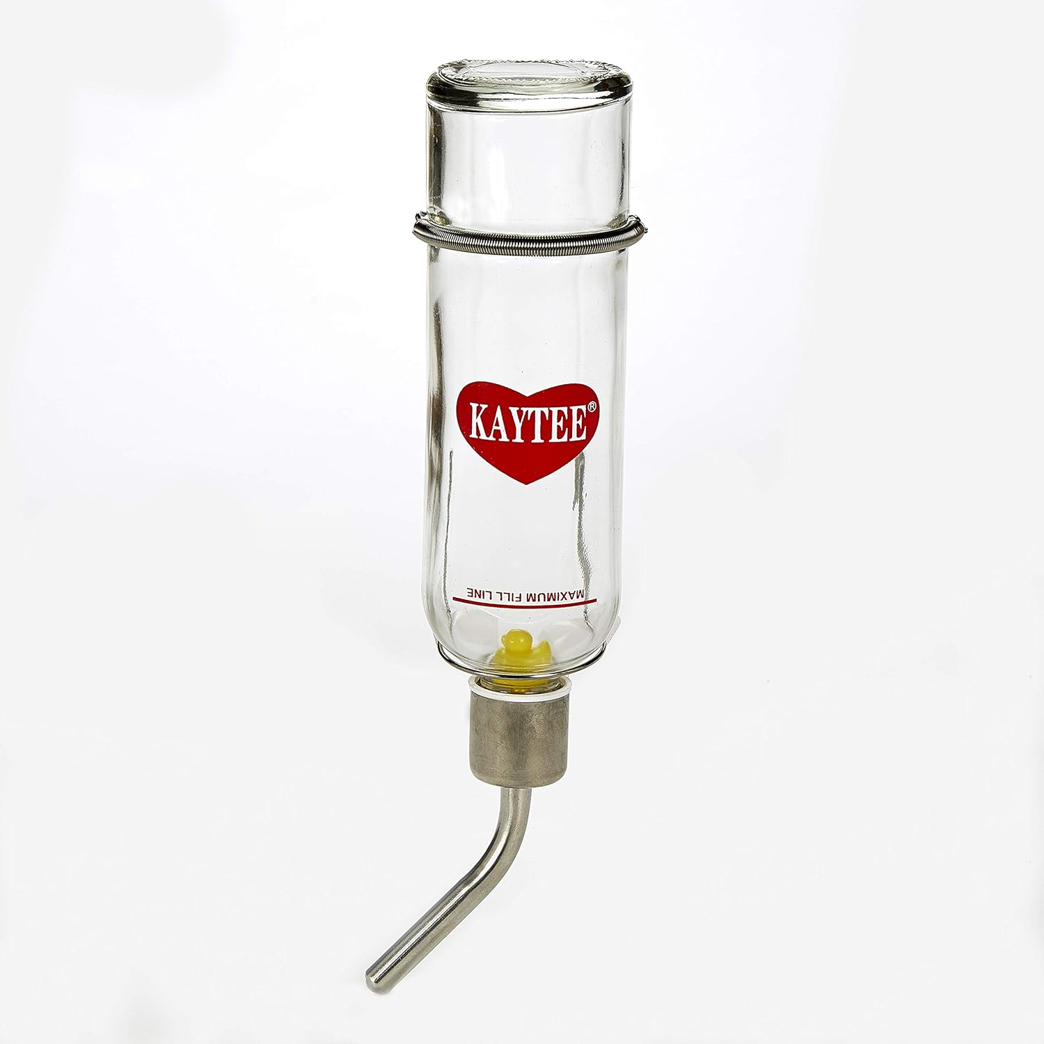 Superior chew resistant water bottle. Glass and stainless steel design. Spring attachment hanger holds bottle securely in place inside or outside any small animal wire home. Features unique double-ball bearing drip resistant sipper tube. Stainless steel cap and floating duck reminder included.