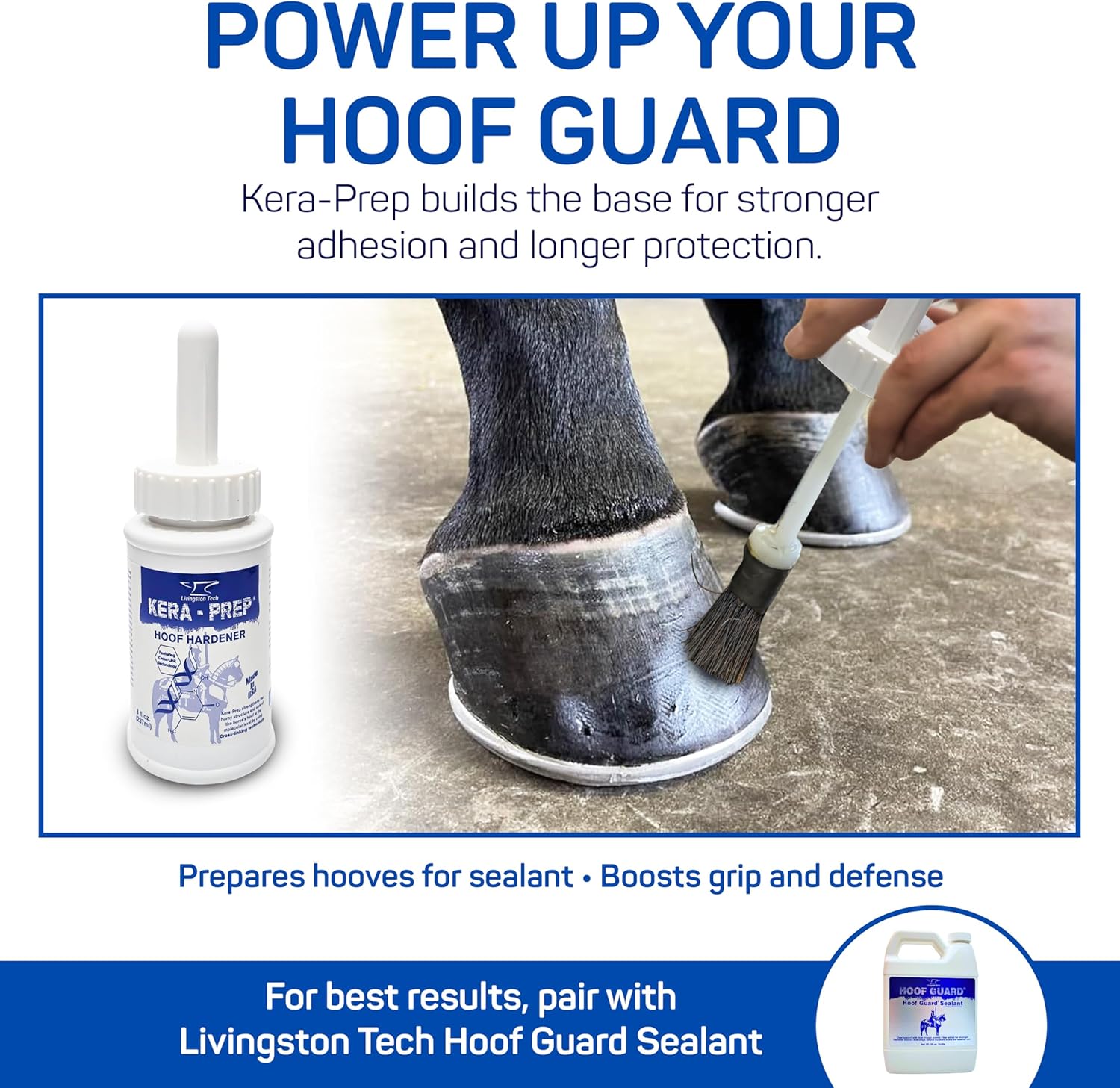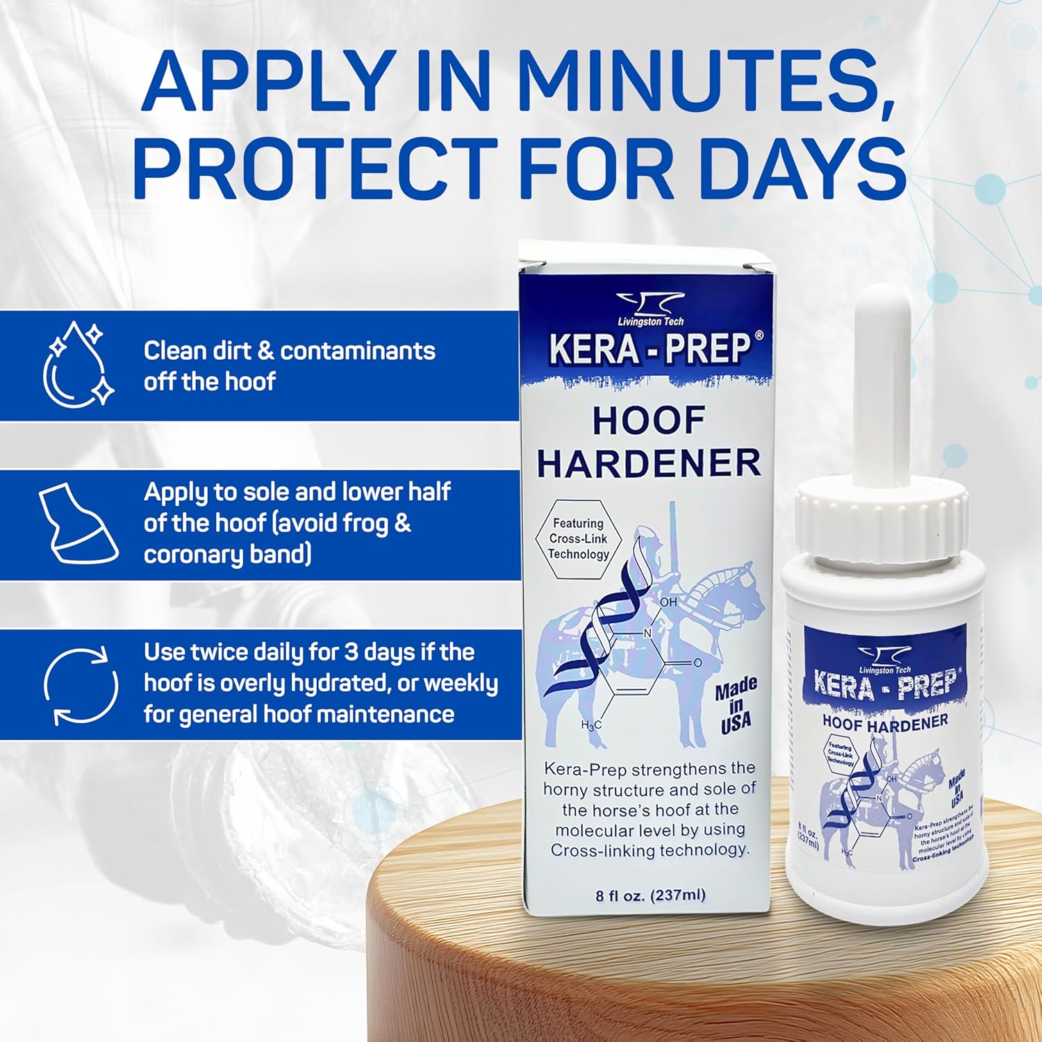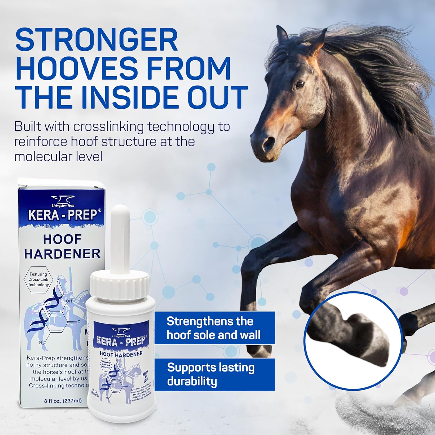 MOLECULAR-LEVEL STRENGTHENING – LivingstonTech Kera Prep Hoof Hardener acts as a hoof conditioner for horses, using cross-linking technology to reinforce hooves from the inside out. It helps support the structure of the hoof wall and sole for better durability through daily wear.