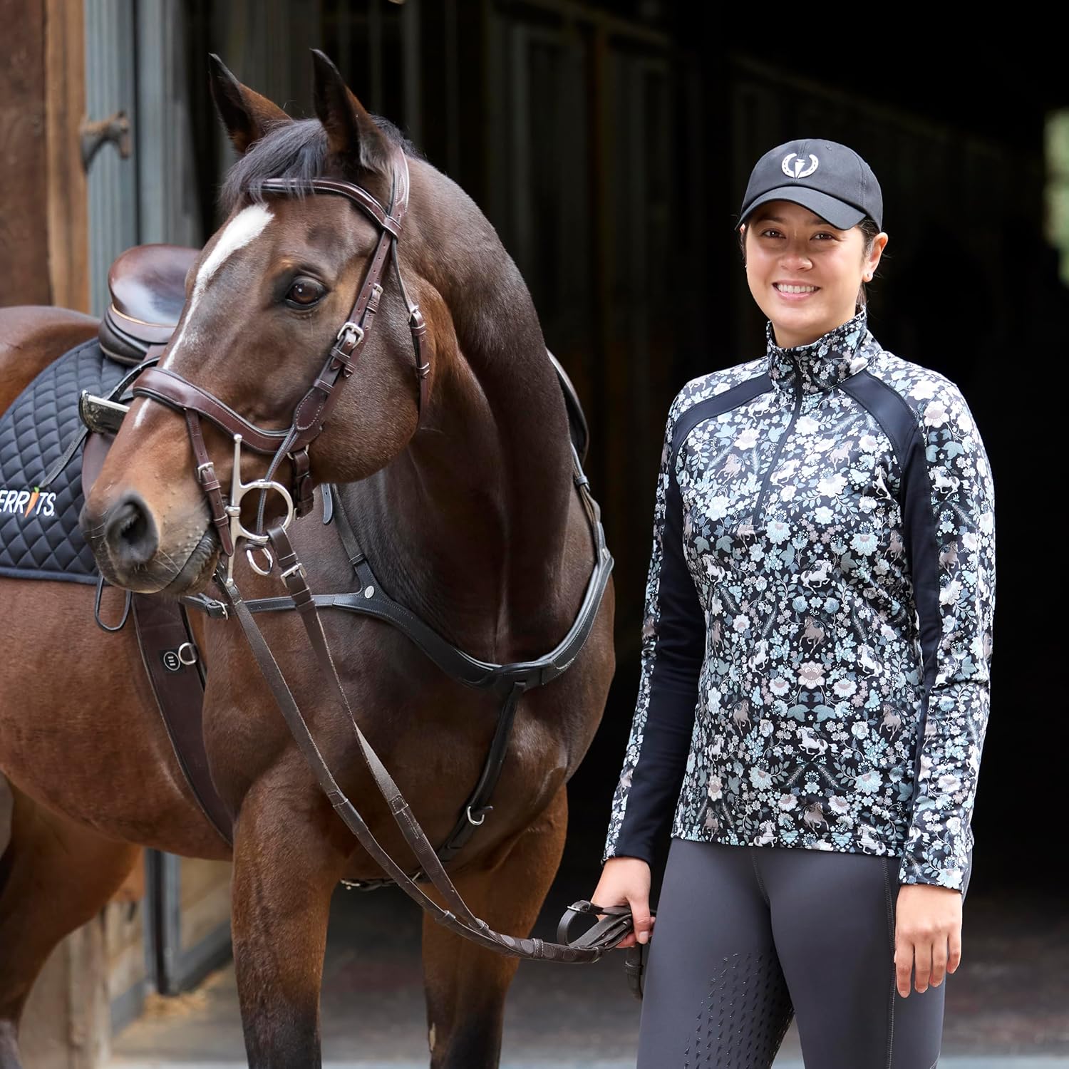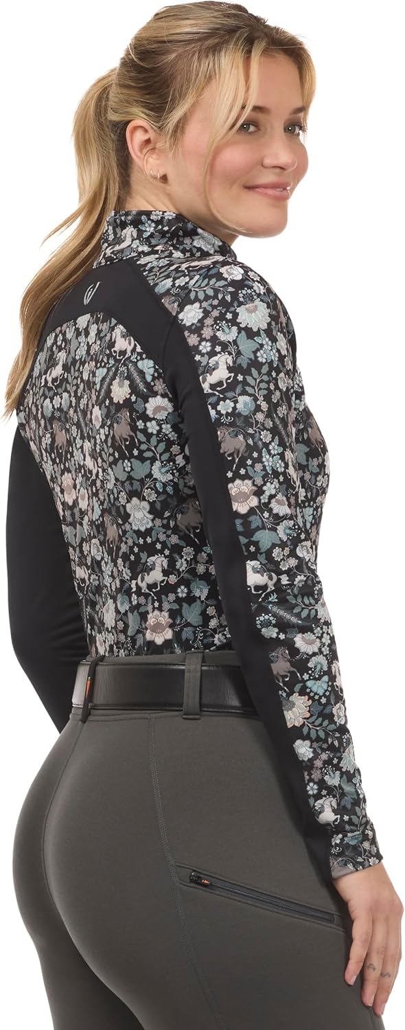 Designed with exclusive equestrian prints that celebrate the spirit of riding, this long sleeve fleece riding top delivers lightweight warmth in a four-way stretch knit for a performance-driven fit. A smooth exterior repels hay, horsehair, and dirt, while the lightly fleeced interior adds cozy comfort. Sporty contrast panels and flat seams create a flattering silhouette, and the quarter zip allows for easy temperature control across seasons.