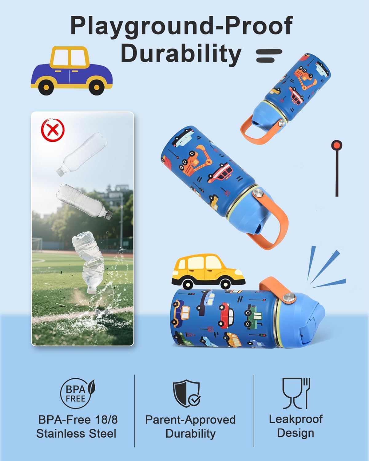 Unbreakable Stainless Steel Design: Built to survive playground tumbles! Made with 100% 304 stainless steel (BPA/lead/PAES-free), this drop-proof insulated toddler water bottle withstands bumps, drops, daily adventures and rough handling for school sports or outdoor fun.