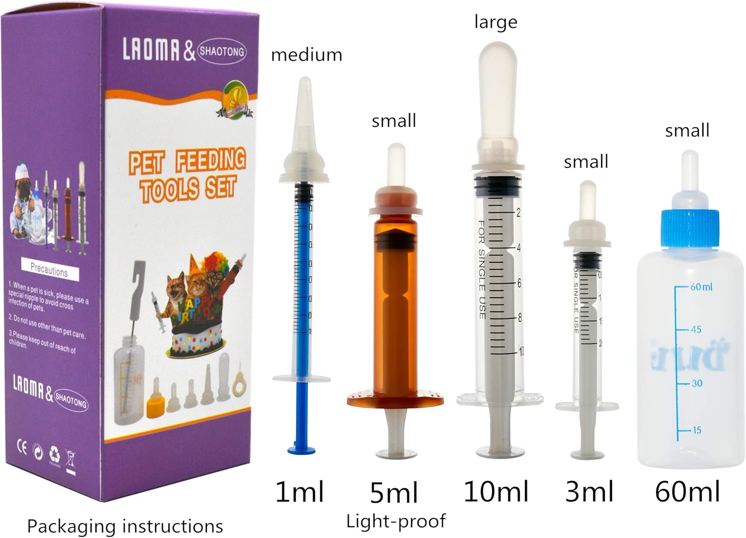 puppy bottles : This is a versatile nipple with 1ml 2ml 5ml 10ml syringe and 60ml pet bottle. The simulated silicone nipples are small, medium and large. Each nipple is free to replace. Very convenient.
