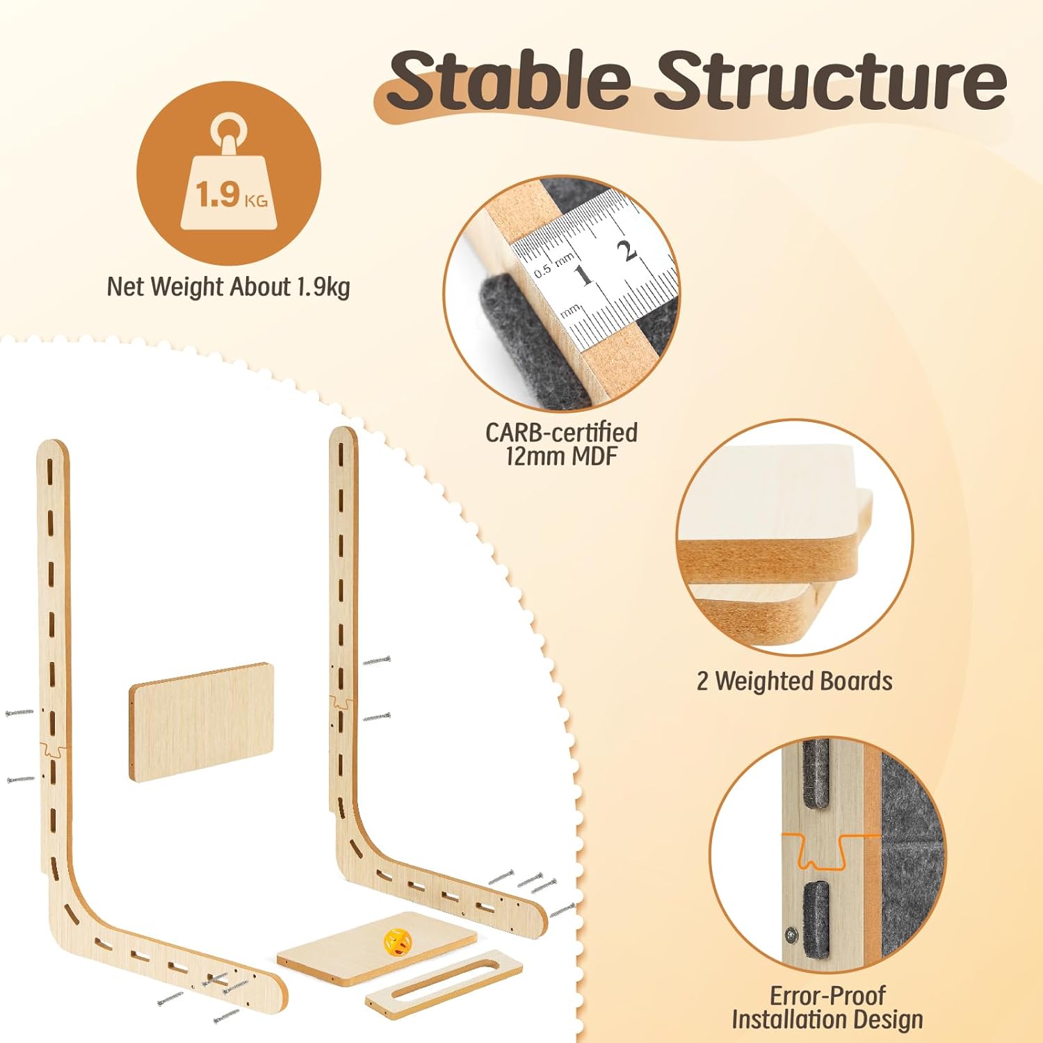 Stable L-Shape & Dual-Sided Use: This stable L-shaped cat scratching board features a 10cm base gap for secure placement against wall skirting. Constructed with a CARB-certified 12mm MDF frame, the cat scratch pad stays firmly in place even during vigorous use. Premium 9mm reversible felt pads maximize lifespan through dual-sided use.