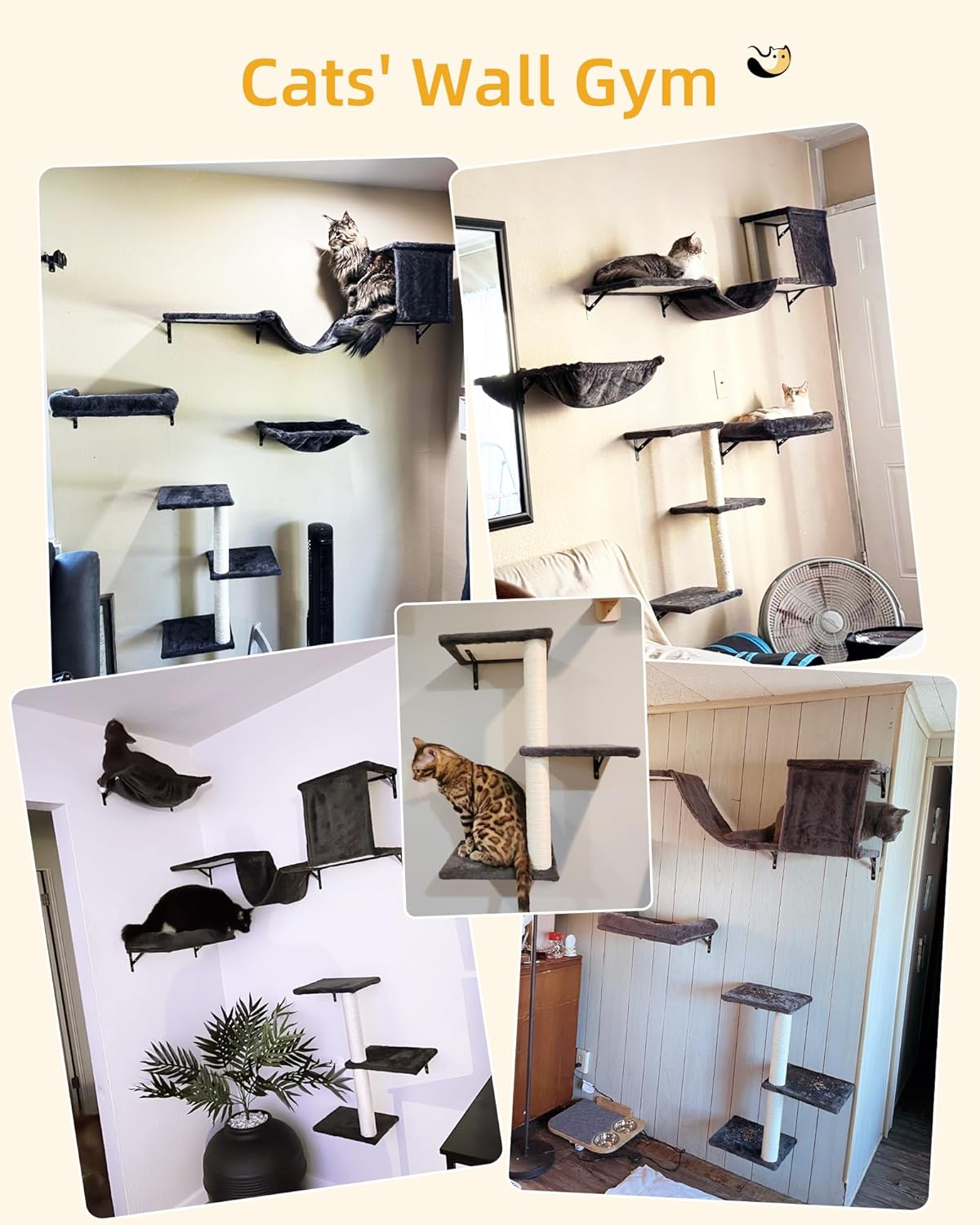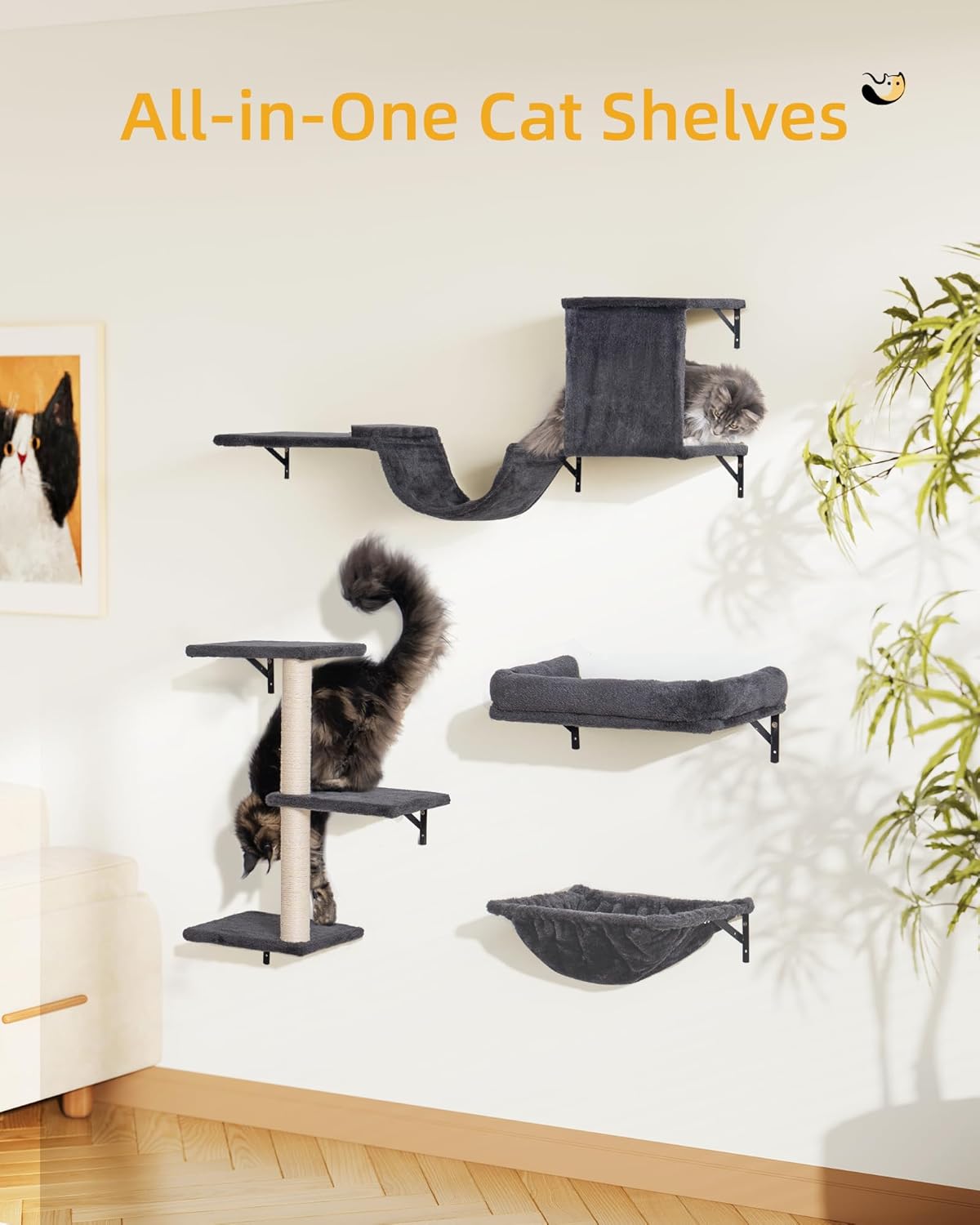 8 reviews for Large Cat Wall Shelves for Big Adult Cats, 5-in-1 Wall Climbing Furniture Set for Indoor Cats w/ 17in Hammock, Perch Bed, Shelf Steps, Scratch Post, Drak Gray