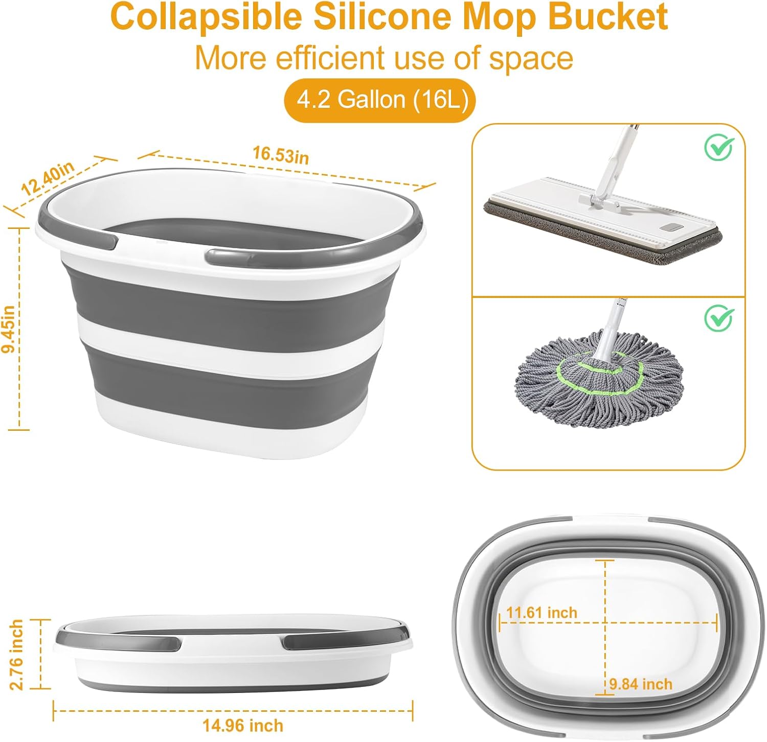 Silicone Collapsible Bucket: The mop bucket can hold up to 15in length floor mop. Buckets for floor cleaning can be folded from 9.45 inches high to only 2.55 inches high,saving 72% on storage space. It designes with hanging holesmopping bucket can be stored under a sofa or hung on the wall