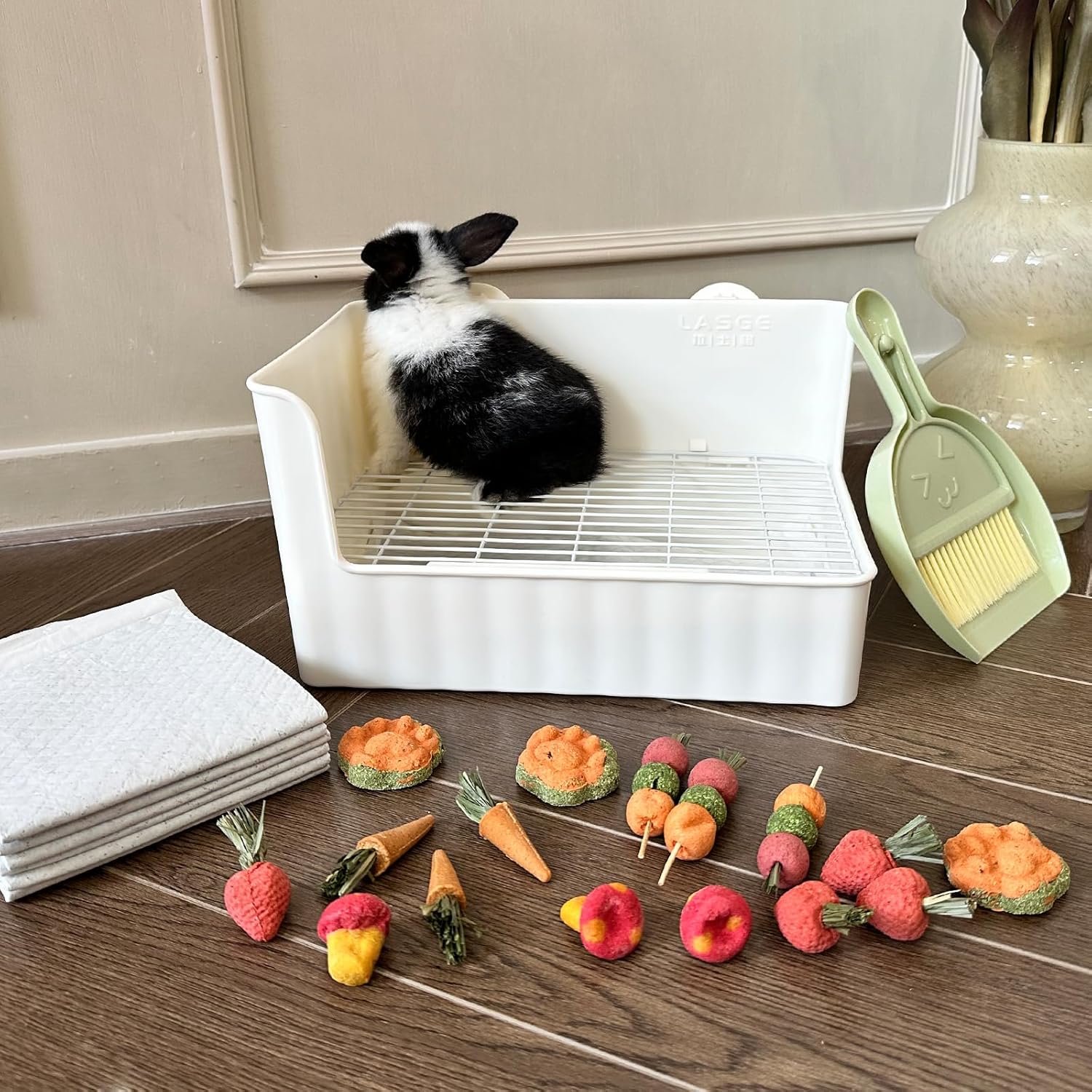 For the same price, you’ll get 10pcs in total! 1*Large rabbit litter box. 1*plastic dustpan and broom set, is perfect for sweeping in and around the litter box. 3*random grass cakes, are good for chewing and playing to add more fun to your pet’s life. And 5 pcs rabbit cage liners,absorbent liners to make clean up even easier!
