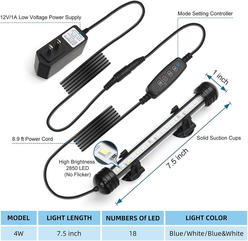 I recently purchased the LED Submersible Aquarium Light and I have to say, it’s been a nice addition to my fish tank. The 4W power provides just the right amount of brightness without overwhelming the fish. I love the option to switch between blue, white, and the combination of both colors. It really adds a pop to the tank and enhances the overall look, especially in the evenings when the fish are most active.One feature that stands out to me is the timer. It automatically turns on and off, which means I no longer have to worry about manually controlling the light, and it keeps everything consistent for the fish. Plus, the dimmer function is a bonus; I can easily adjust the brightness depending on the time of day or my mood.At just 7.5 inches, it fits perfectly in my tank without taking up too much space. Overall, Iâm really happy with this light. Itâs easy to install, has great features, and makes my aquarium look fantastic. If you’re looking for a simple solution to light up your fish tank, I definitely recommend giving this one a try!