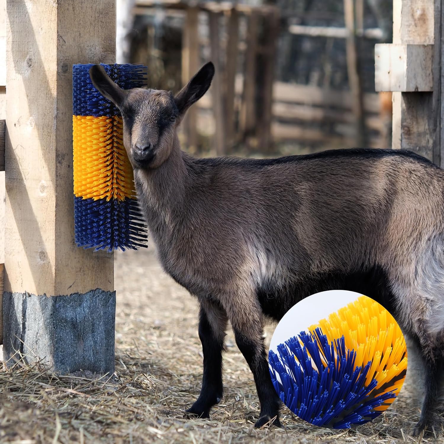 I’m really impressed with this livestock scratching brush! The bright blue and yellow colors immediately attracted my cows, and they love using it. It’s made of durable nylon with soft bristles, so I know it’s safe and long-lasting. I’ve noticed my cows seem less stressed and even healthier since installing it, and it was super easy to attach to a fence post. It works well for my other animals too. Highly recommend for anyone with livestock!
