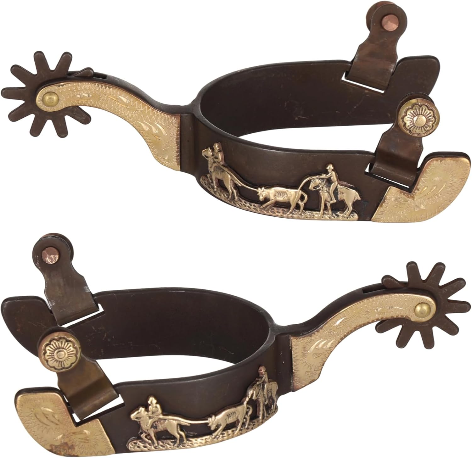 Lnrueg 2 Pcs Western Spurs, Cowboy Boot Spurs with Turnable Gear, Antique Copper and Brass Design with Engraved Trims, Retro Low Carbon Steel Horse Spurs