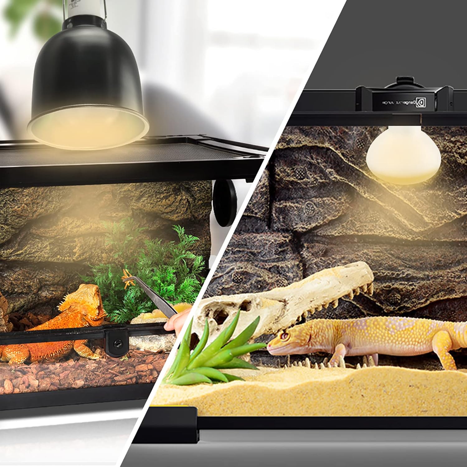 🦎SAFETY INSTRUCTIONS – You must use good quality ceramic lamp holders, and do not use it when the voltage is unstable. Do not use it with dimmers, thermostats, and rheostats. Do not splash water on the basking light bulb during use. When using the reptile basking bulb, keep a distance of more than 30cm from reptiles. Do not turn on the heat bulb immediately after turning it off, and do not turn the bulb on and off frequently.