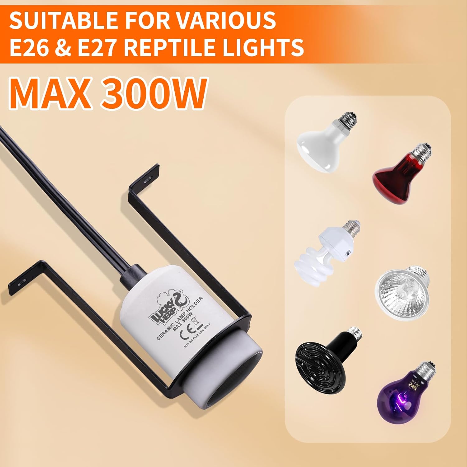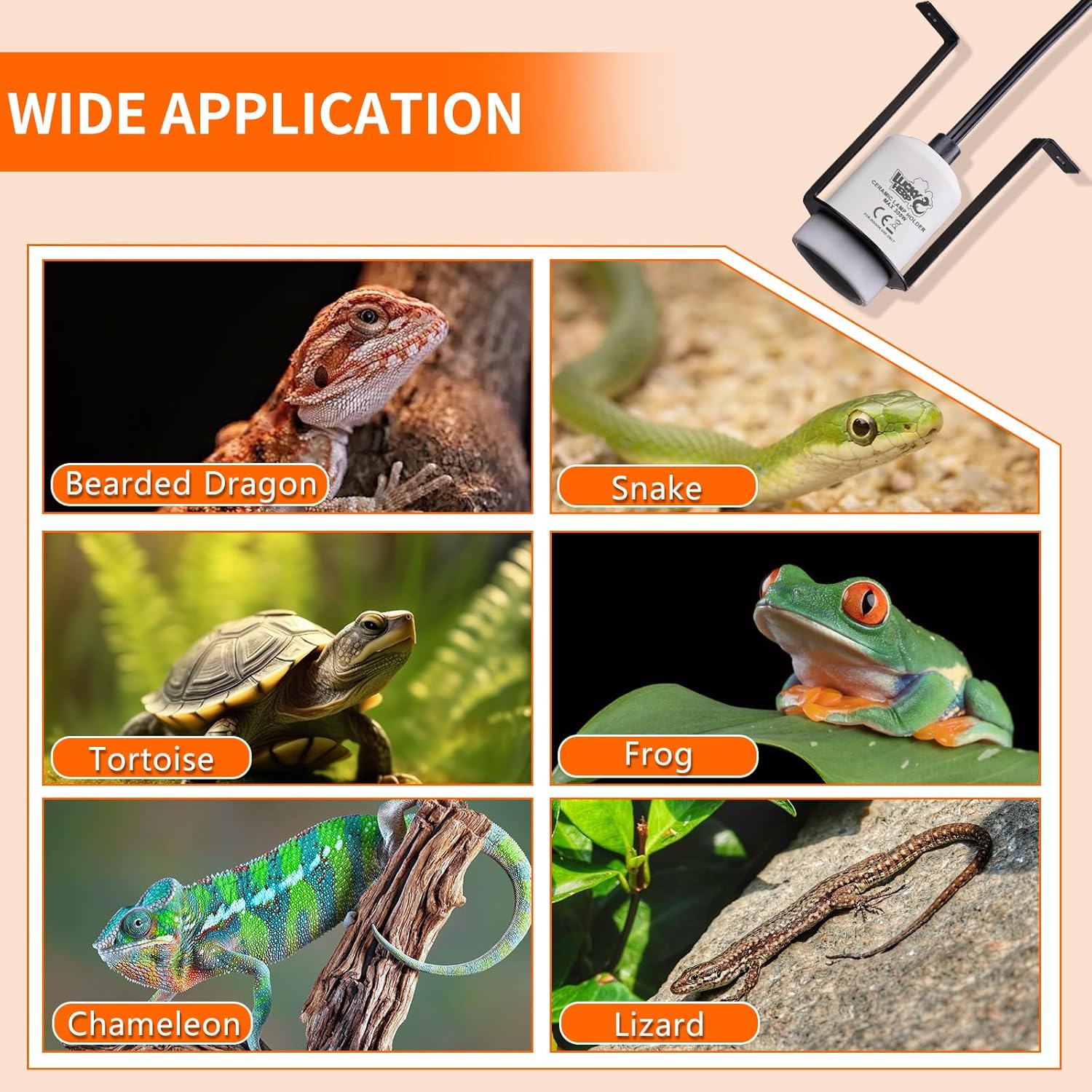 Comes with E27 bulb base, compatible with a variety of bulbs. Such as ceramic heat emitters, UVA UVB bulbs, infrared heat lamps, etc. (Note: no bulbs). Can be used for a variety of reptiles and amphibians, including bearded dragons, geckos, snakes, turtles, tortoises, iguanas, lizards, chameleons, frogs, toads, etc.