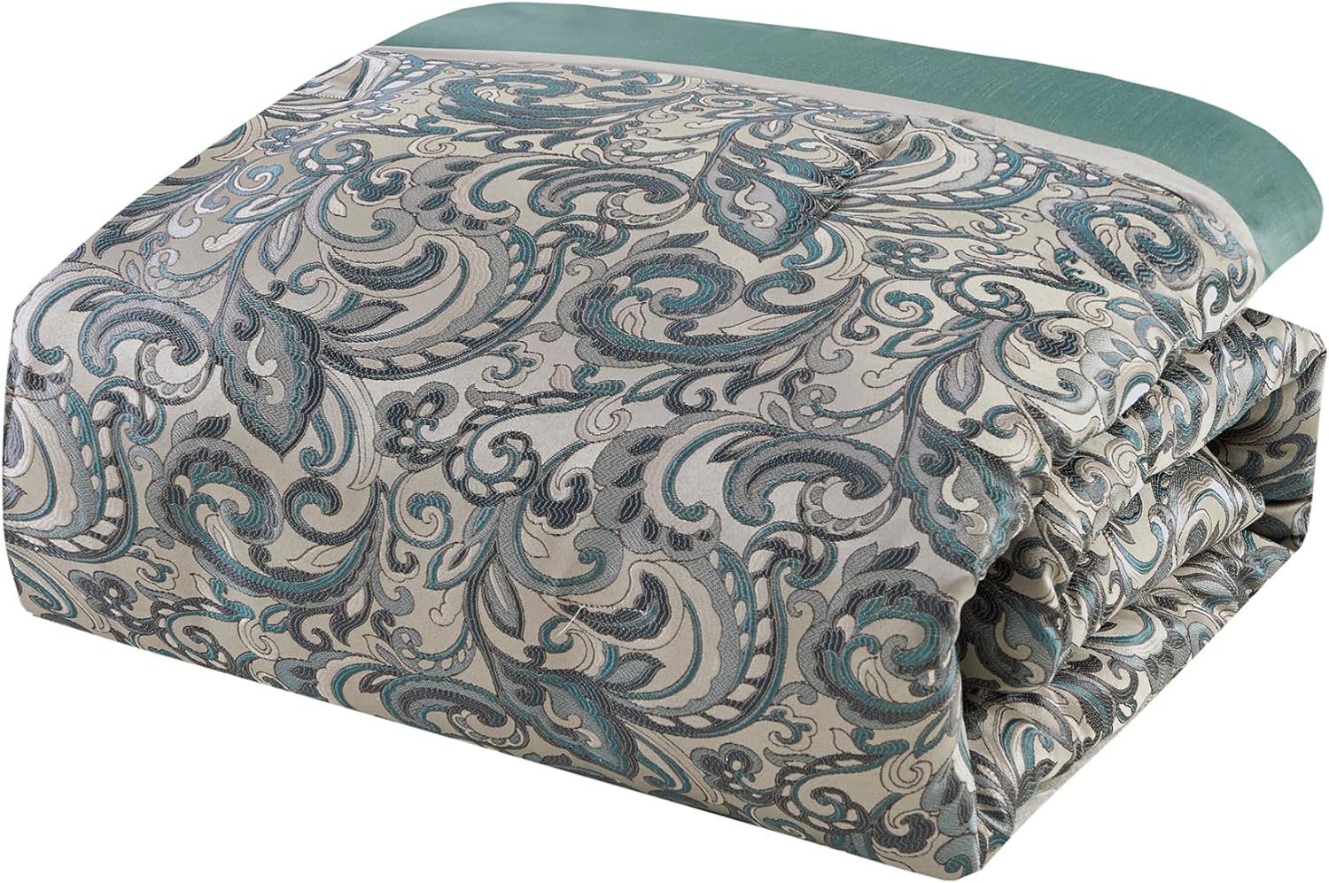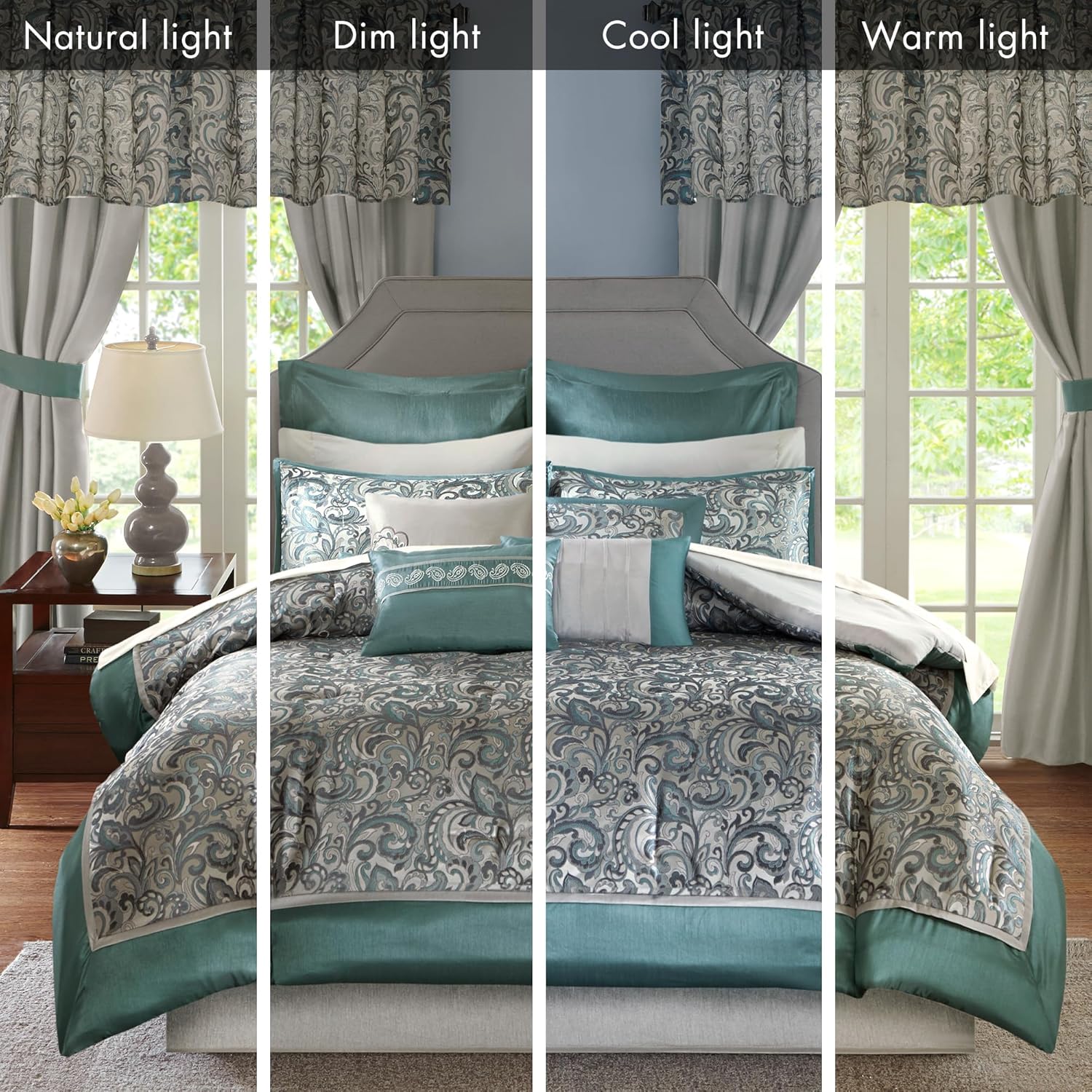 Madison Park 24 Piece Faux Silk Paisley Queen Comforter Set with Matching Curtains, Down Alternative Hypoallergenic – Teal, Queen (90 in x 90 in)
