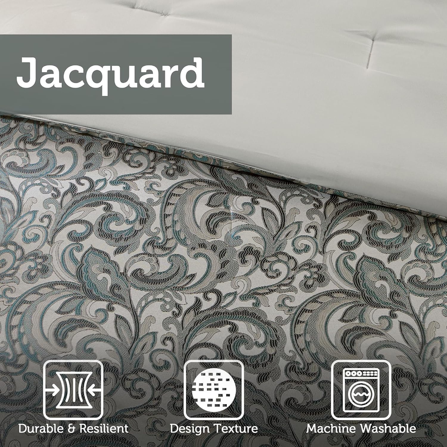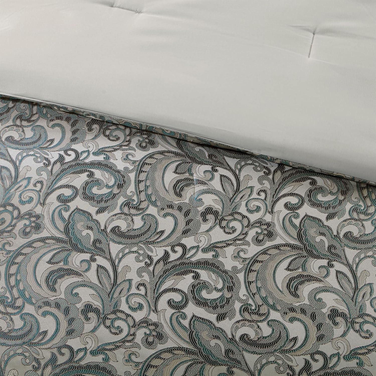 The Madison Park Essentials Brystol 24 Piece Room in a Bag provides a total makeover for your bedroom decor. This traditional comforter flaunts a teal and grey jacquard paisley pattern with an accenting solid teal border to create a luxurious glam look. Matching pillow shams and solid teal Euro shams with 2-inch flanges coordinate beautifully with the elegant comforter. A solid grey bed skirt and 4 decorative pillows with embroidery and pleating details add the finishing touches to this paisley bedding set. Polyester filling in the comforter and pillows contains no allergens and is treated to be dustproof. A 4 Piece sheet set is also included to complement the comforter and complete the jacquard bedding set. To elevate your bedroom, 4 solid teal window curtains with 2 paisley valances and 2 solid tiebacks are included to perfectly style your windows. Machine washable for easy care, this paisley comforter set may come in rolled or compressed packing and will need to be fluffed up. Use a steam iron to help remove wrinkles easier. Spot clean pillows.