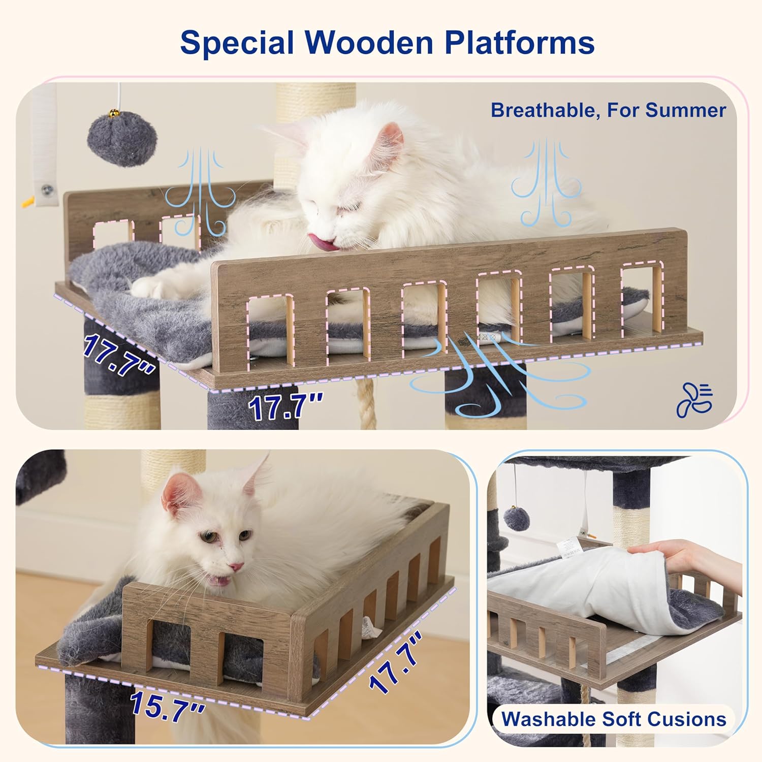 2 Wooden Perches: This tall cat tree is specially designed with two wooden platforms at different heights to help cats of all sizes climb freely. Additionally, the soft cushions on the platforms are not only non-slip but also make it comfortable to rest.
