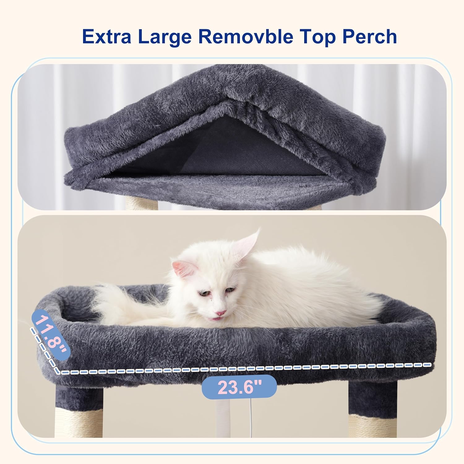 Removable Top Perch:This big cat tree with top perch(23.6” L*11.8”W)is specially designed for adult large cats including Maine Coon. The fully padded edges allow your pet to lie down comfortably. Meantime, the fabric cover is detachable as your need.