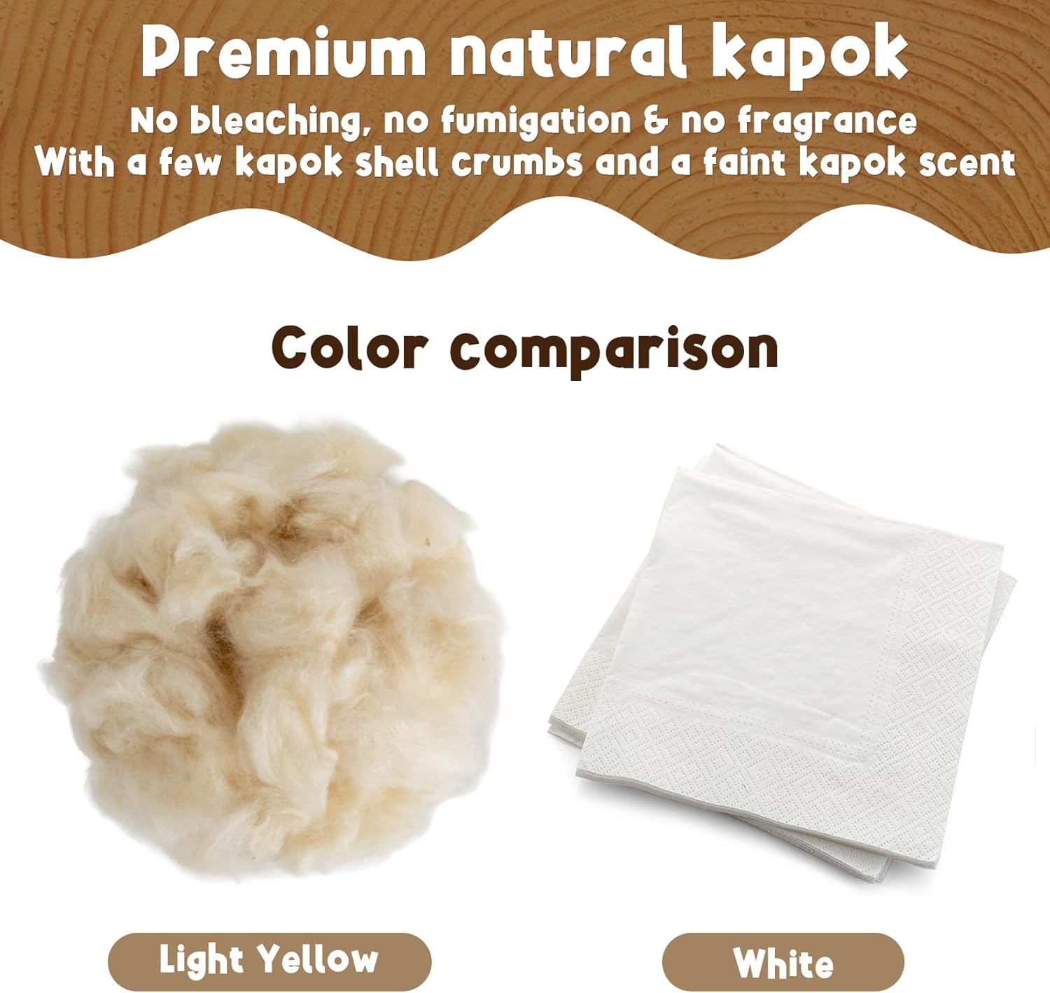 Product specs: 3.5OZ natural kapok in vacuum-sealed flat packaging (locks out moisture/air for better value). Unseal, let sit a few minutes to expand. Note: Natural product may have small kapok shell bits.Please note before purchasing.