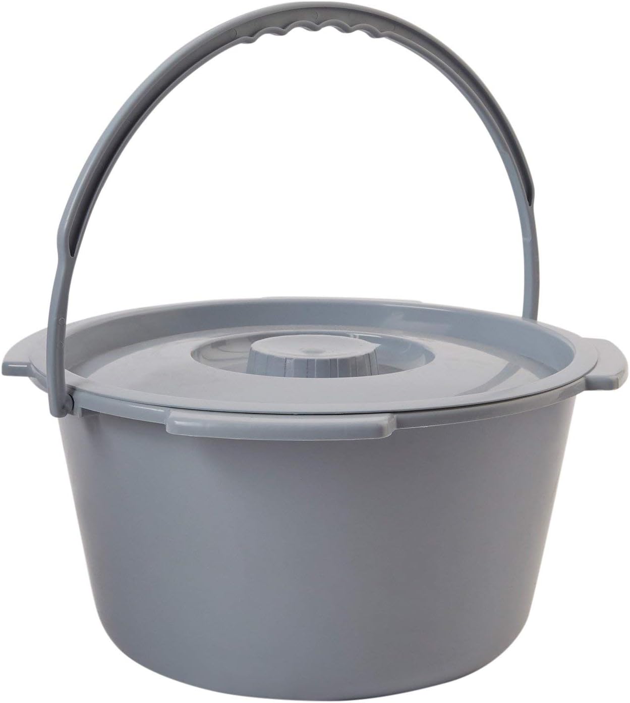 Commode chair bucket includes lid and easy-to-grip handle for easy transportation and carrying