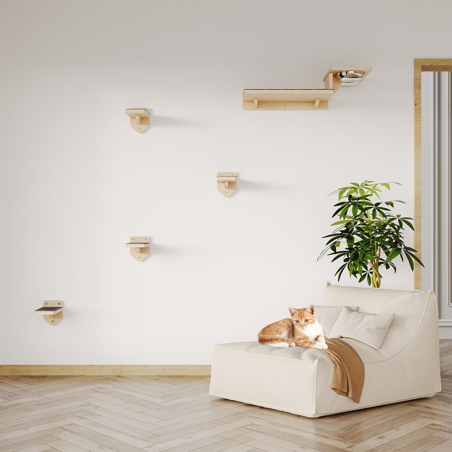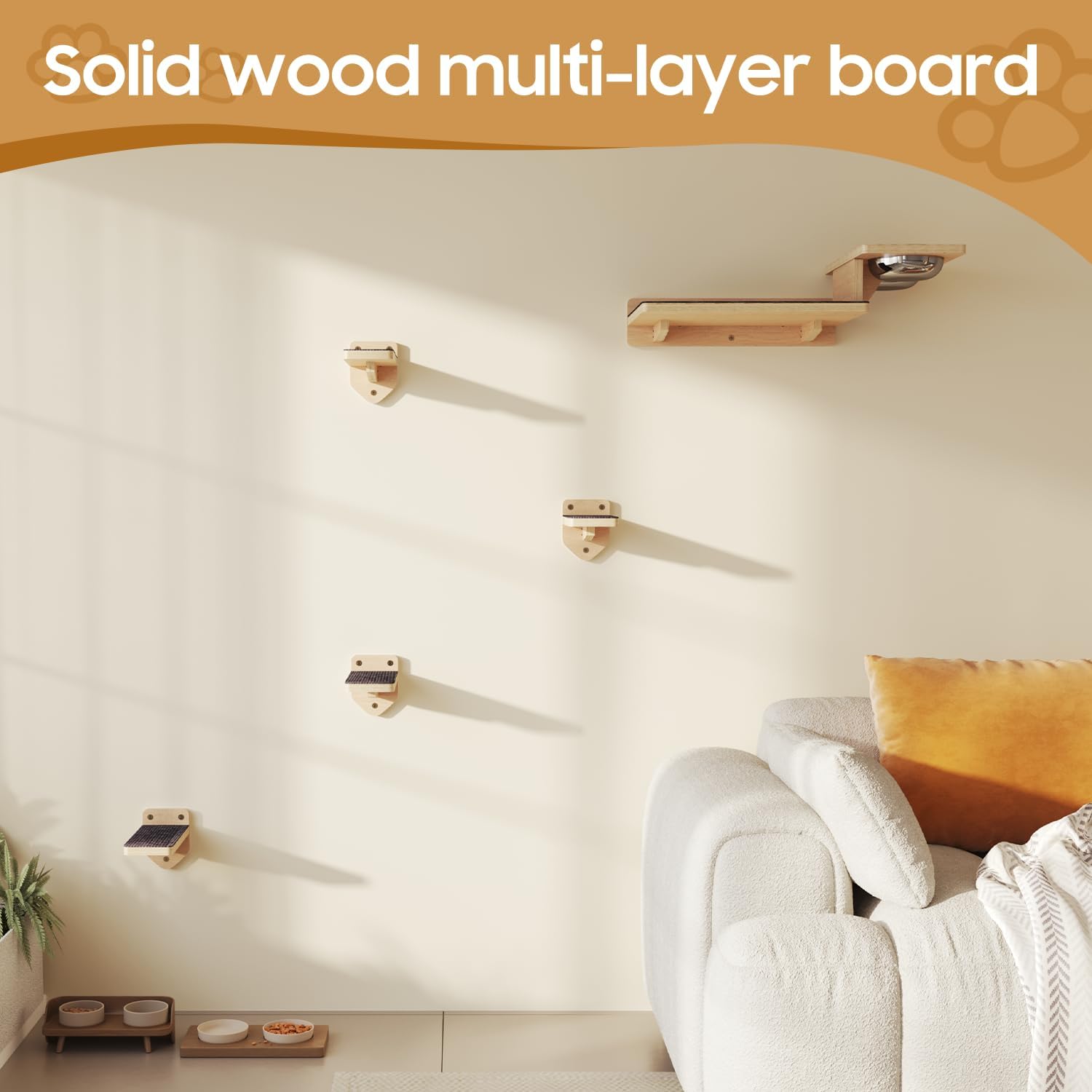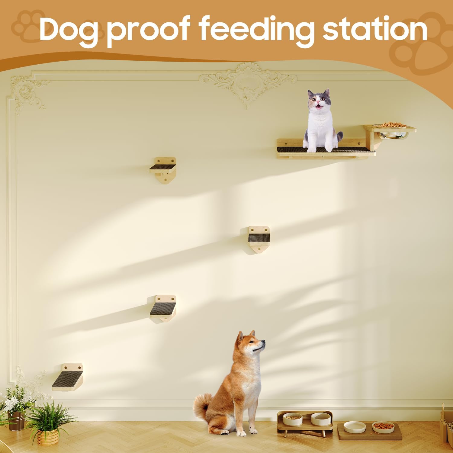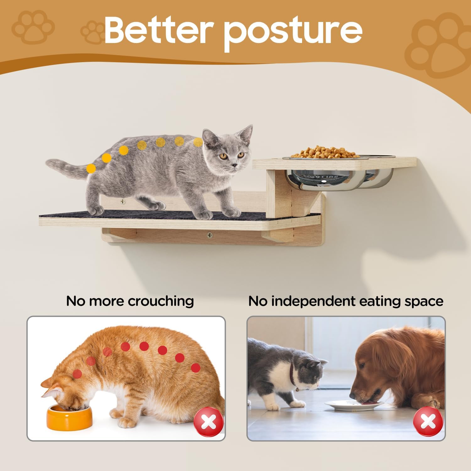 Cat wall shelves: The cat furniture is designed for climbing, perching, and providing your cat with a variety of choices for a more engaging setup. Unlike other cat wall racks, our cat wall rack features a dog-proof cat feeding station to protect your cat’s cervical spine while eating