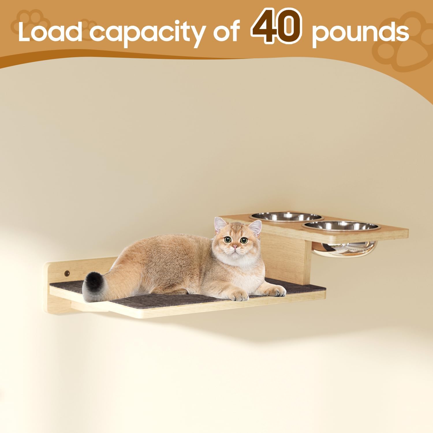 MeowHomm Cat Wall Shelves, Wood Cat Feeding Shelf with 4 Non-Slip Steps, 2 Food Bowls, Wall-Mounted Furniture for Kittens