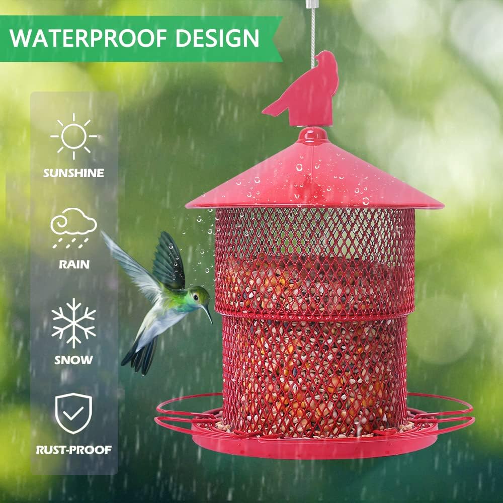 Durable Hanging Bird Feeders:The iron mesh and locking mechanism on this top can keep your seeds away from most pesky squirrels. Not 100% squirrel proof. For security,please hang it away from the smart squirrels range.