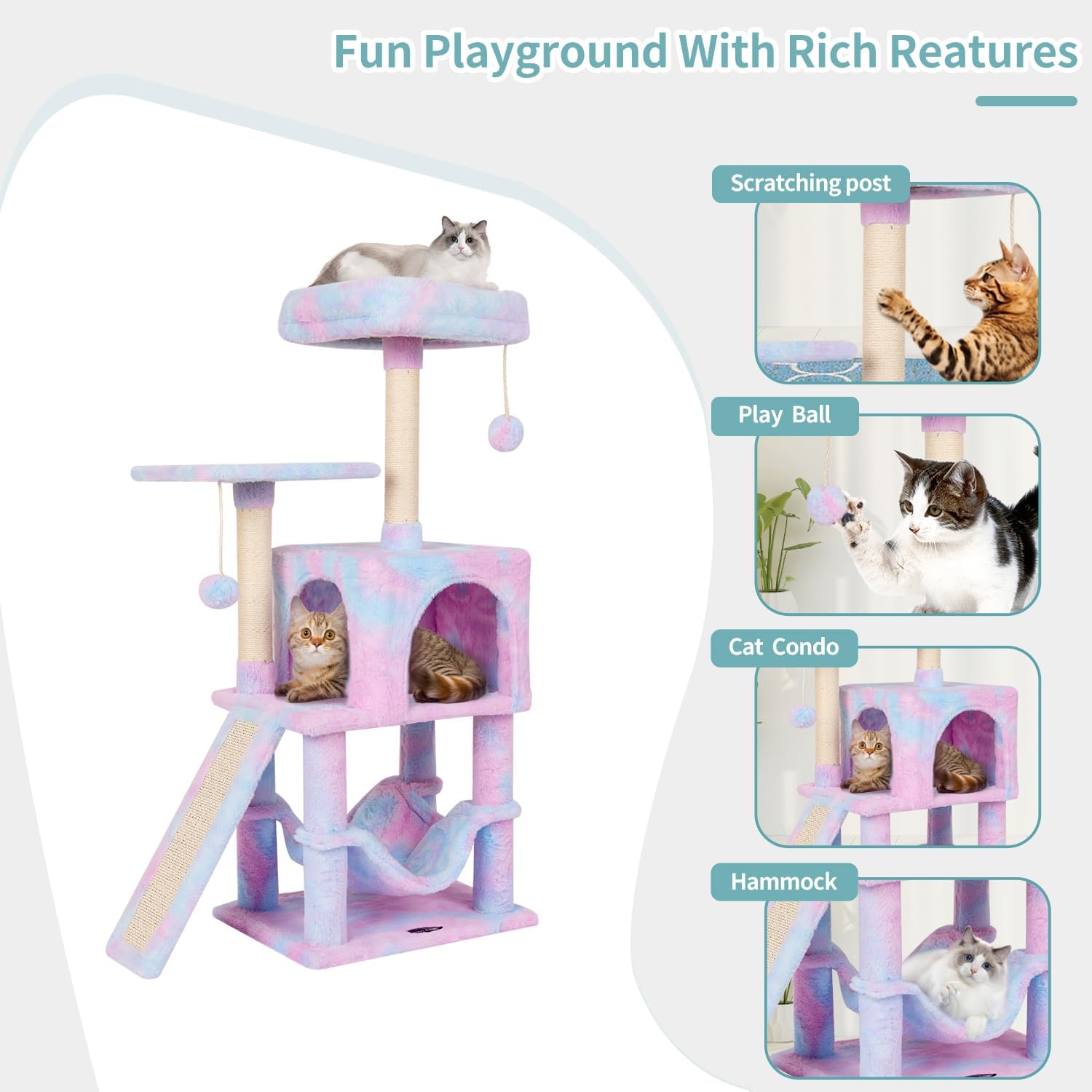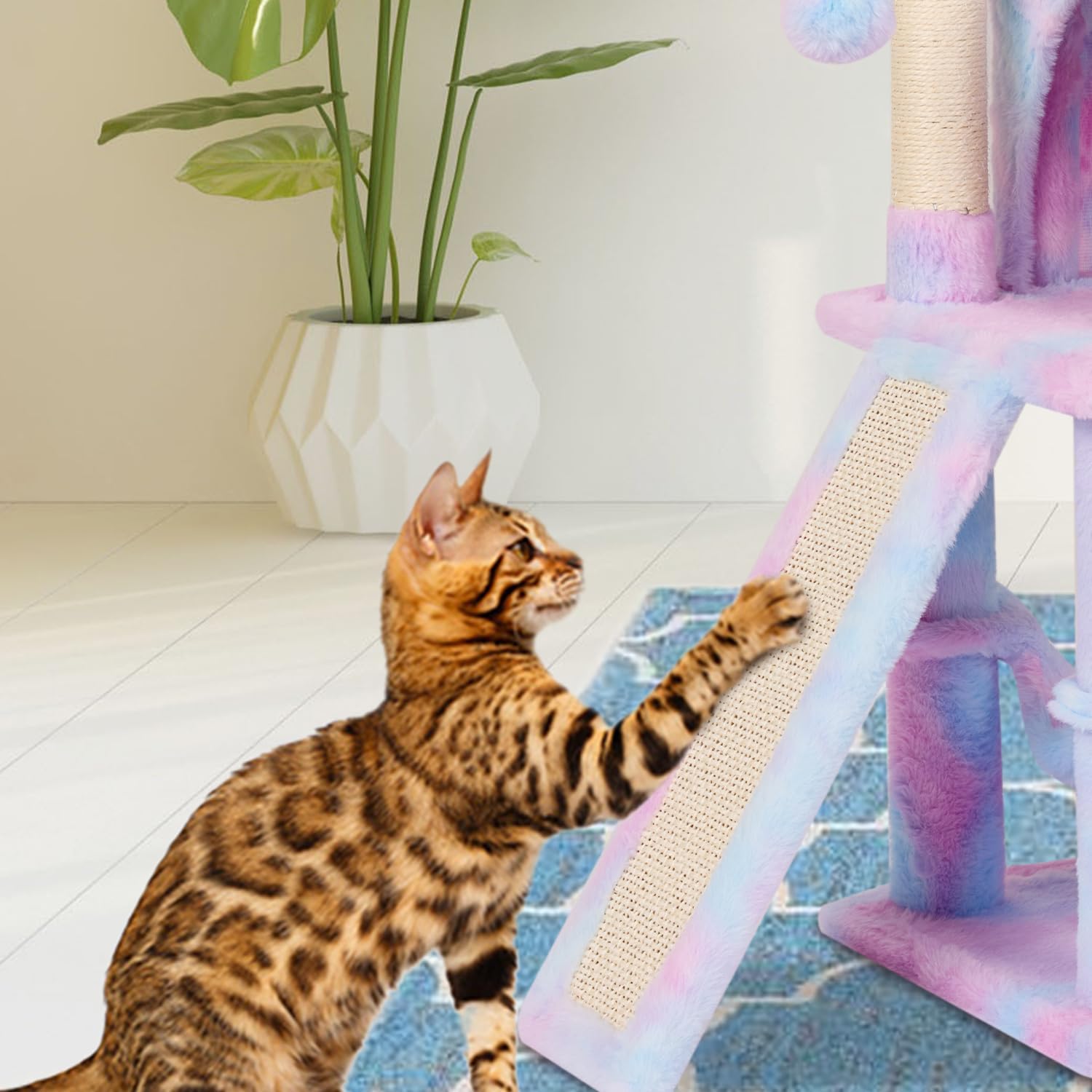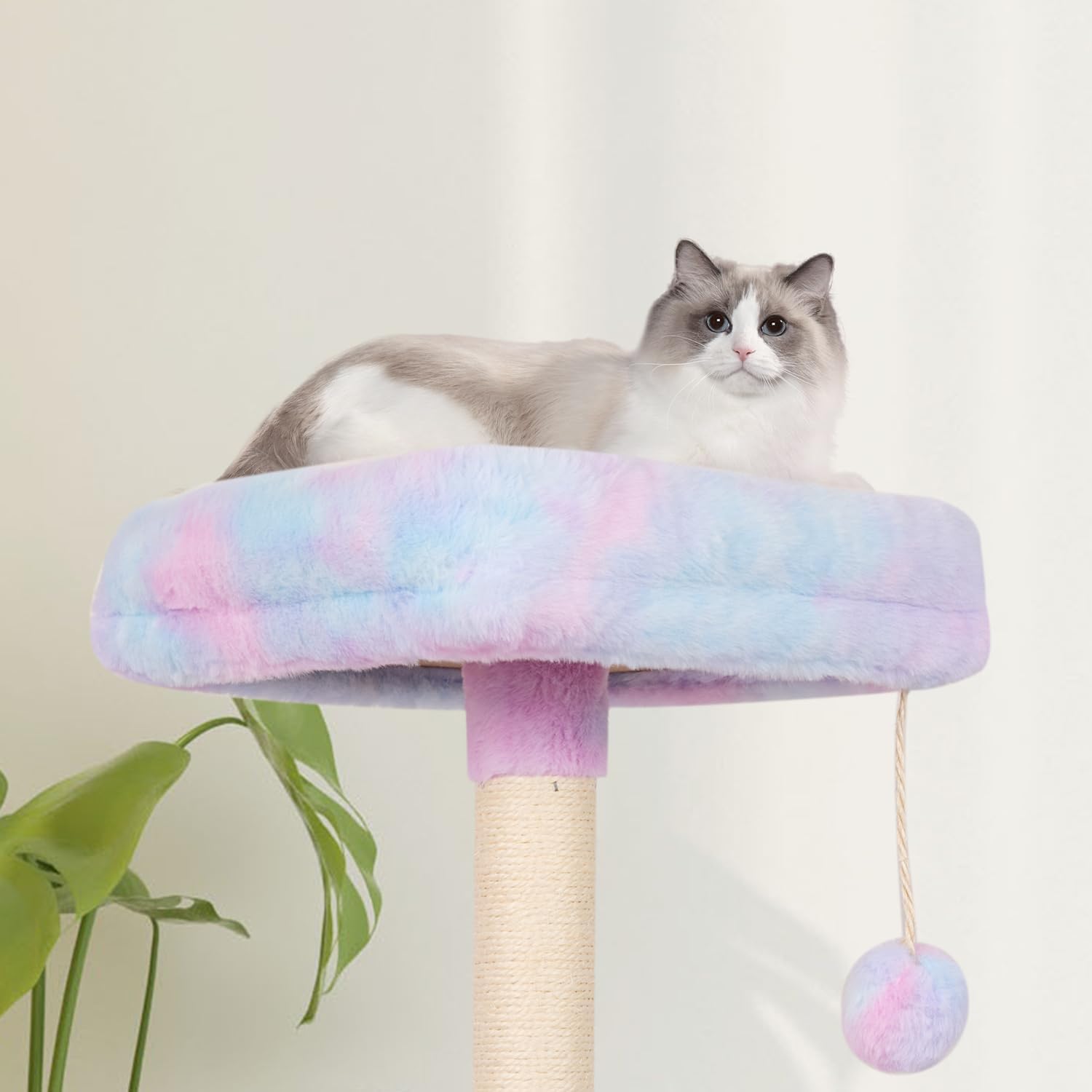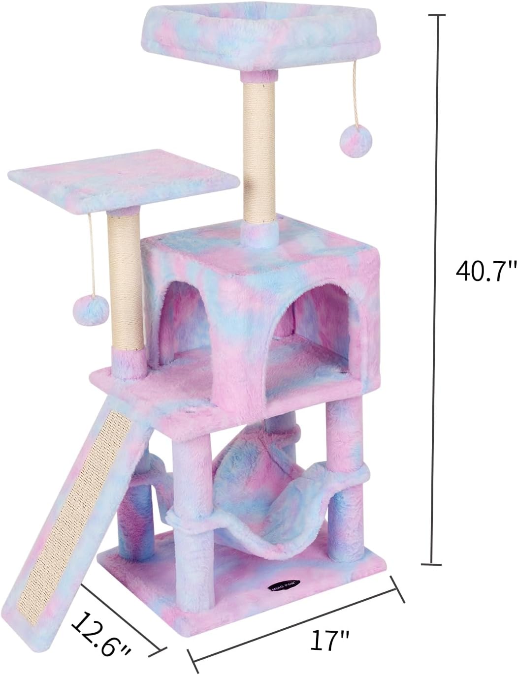 Really happy with this cat tower. The pastel tie-dye design with soft pink, purple, and blue tones is surprisingly cute without being overwhelming or out of placeâit actually blends into my space better than I expected. It doesnât scream âcat furnitureâ the way some of the overly bright or bulky ones do.It was easy to put together, feels solid once assembled, and doesnât wobble at all, even when my cat jumps on and off the higher levels. The fabric is soft but not flimsy, and thereâs a good mix of cozy spots to curl up in and places to perch and observe the room. My cat took to it immediately and pretty much claimed it as his throne within the first hour.