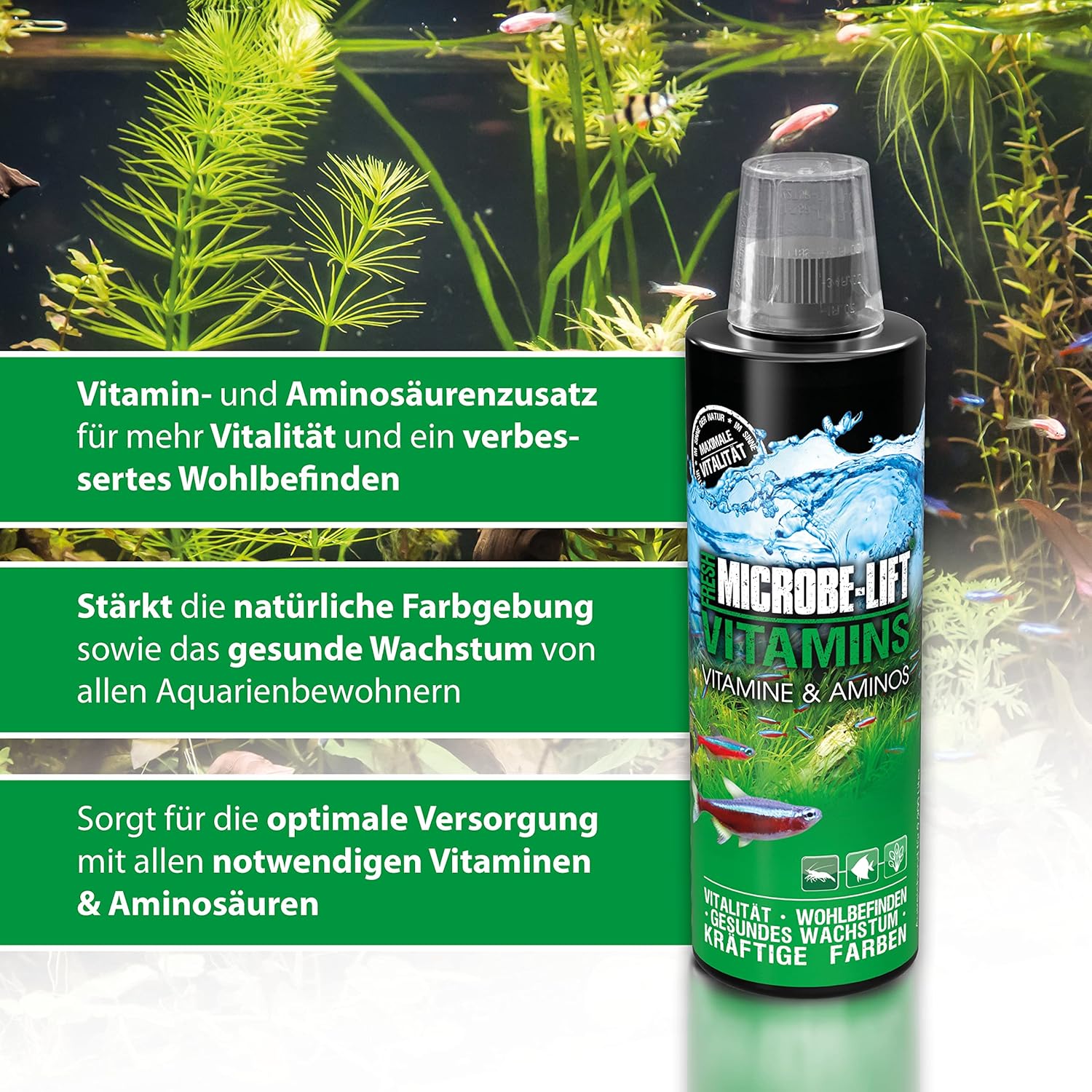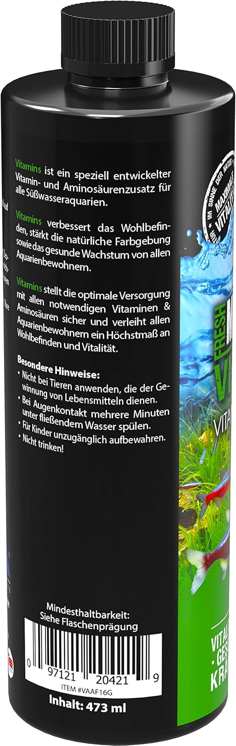 Premium vitamins and amino acids, specially developed premium vitamins and amino acids for use in freshwater aquariums. Vitamins and amino acids provide the inhabitants with the most important vitamins and amino acids for an improved immune system, more vitality and healthy growth. Features and Benefits:- Ensures more vitality. – Supports the immune system. – Encourages healthy growth Vitamins and amino acids are important components in fresh water, they improve the immune system and contribute considerably to healthy maintenance. Prevention is known to be better than healing.