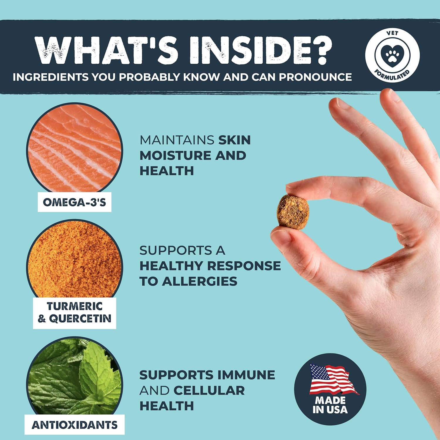 Soothe the Itch: Our immune and allergy supplement unleashes the dynamic power of Omega-3’s, Quercetin, and Turmeric to promote immune system health and support your pups season allergy response.