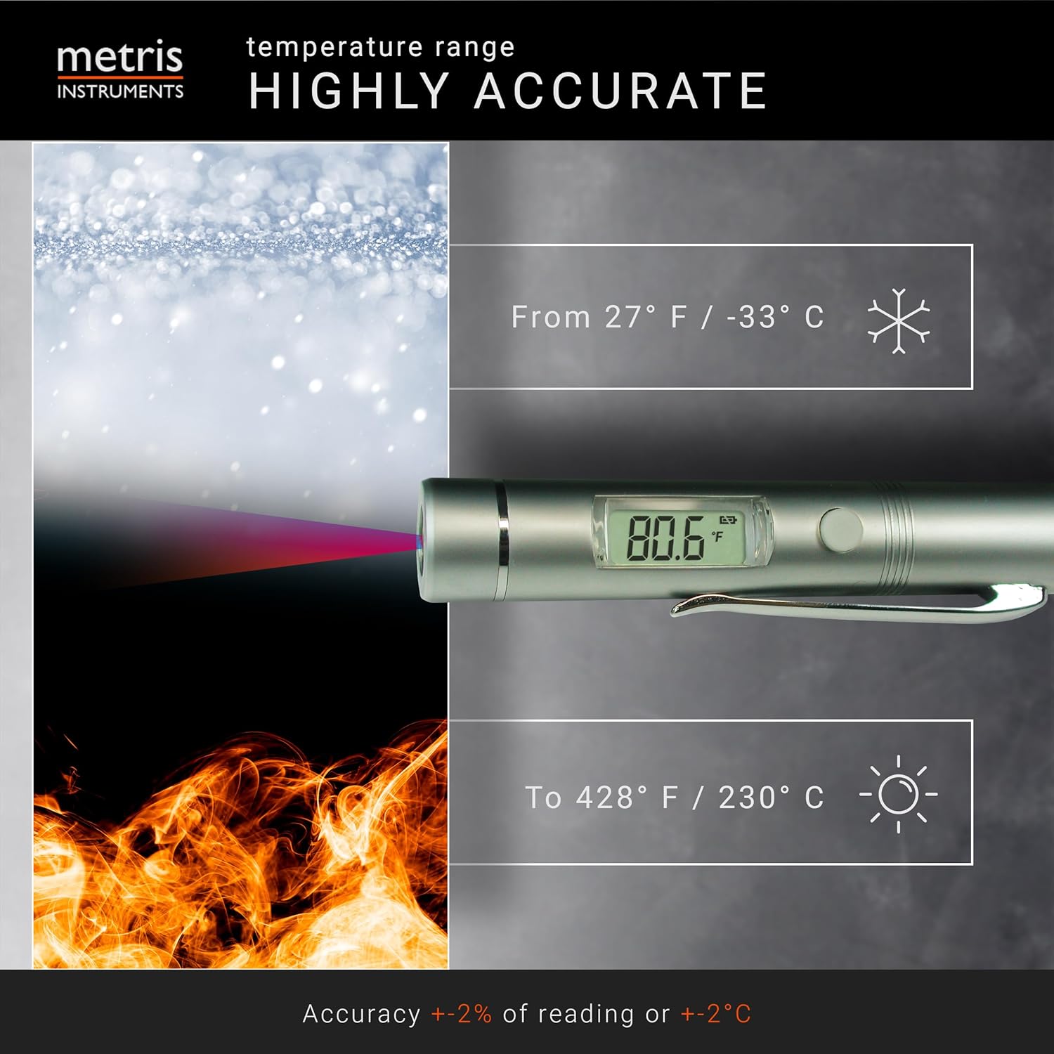PROFESSIONAL GRADE/ SAFETY FIRST: Certified to UL4200A Reese’s Law (2024.09 Reese’s Law – Consumer Product Safety Commission); the infrared thermometer measures the surface temperature of the target area; accuracy range within +/- 2% of reading