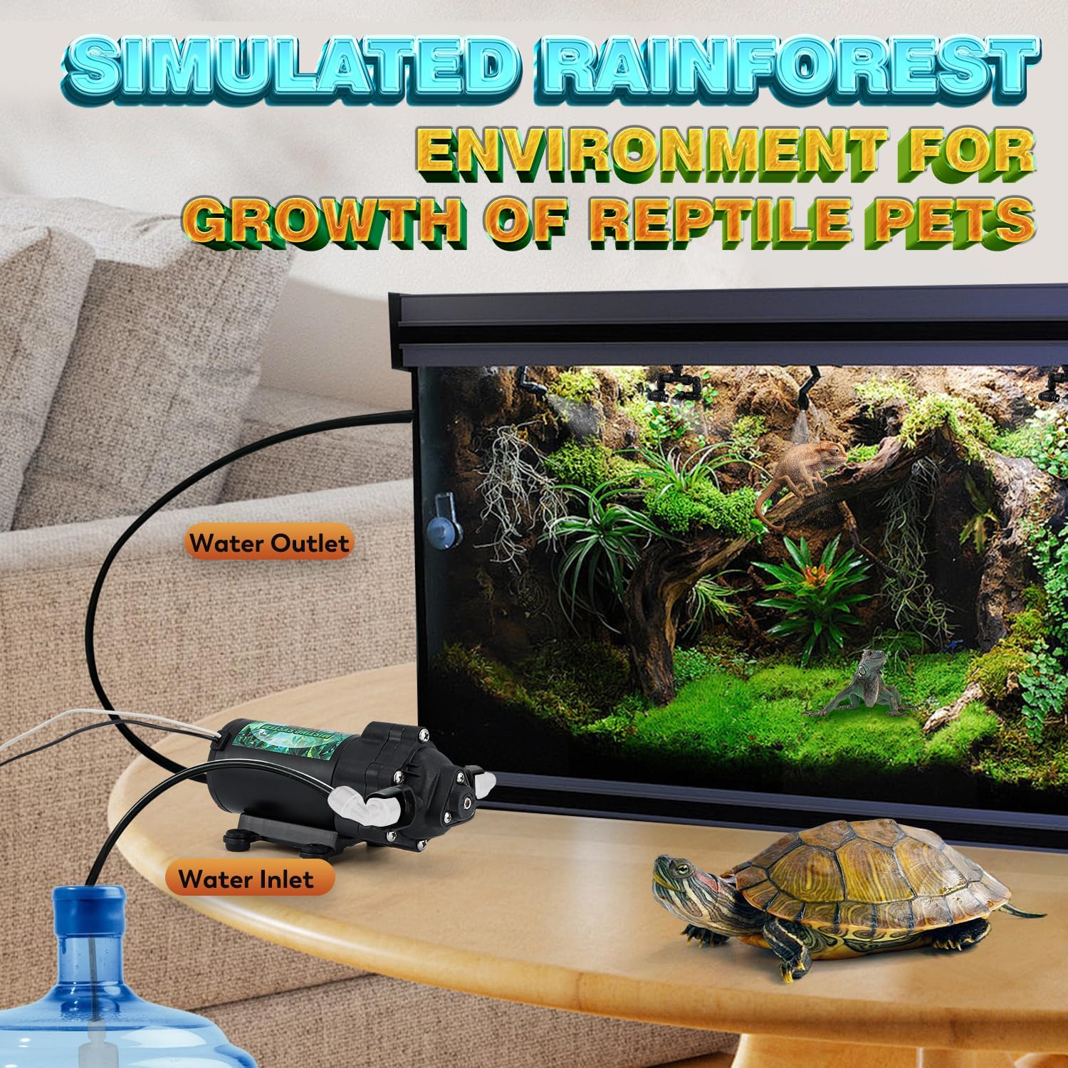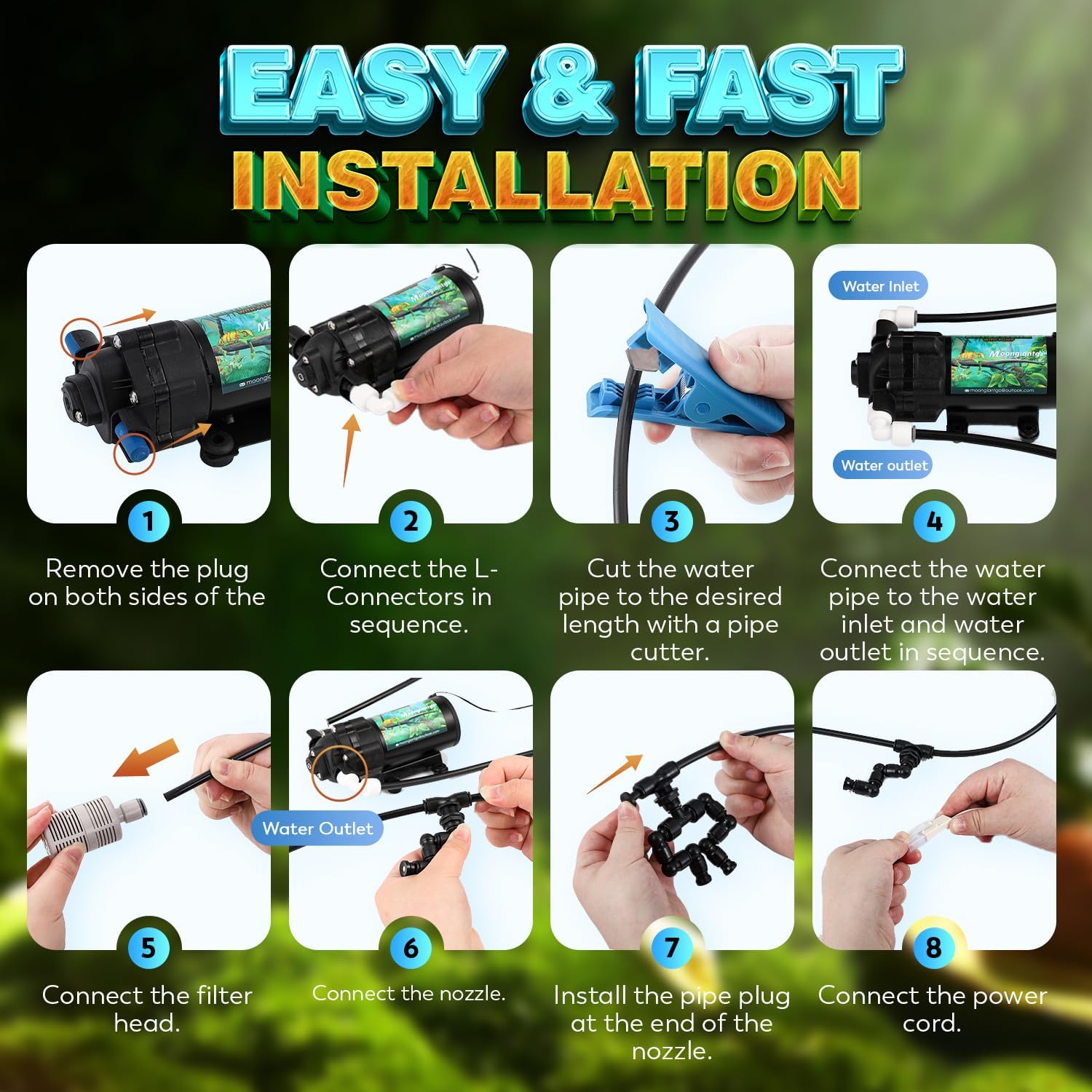 Quick DIY Installation Our reptile spray kit includes all the necessary accessories – Misting Pump*1, Double Nozzle*2, Single Nozzle*4, L- Connector*4, Pipe Cutter*1, Timer Socket*1, Water Pipe*1, etc. A 5-meter/16.4-foot water pipe allows you to cut the length as needed, and DIY your rainforest misting system to start a unique spraying time for your reptile pets.
