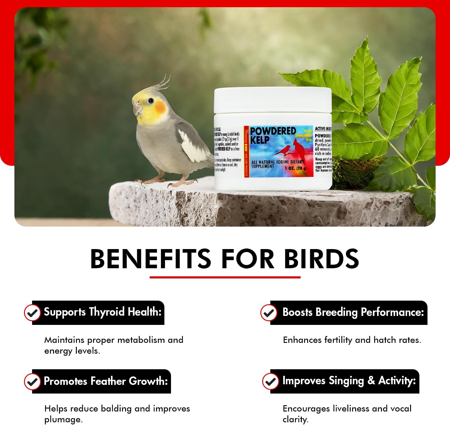 Supports Healthy Thyroid Function: Powdered Kelp is rich in iodine, a crucial element for thyroid health. Birds need iodine for proper thyroid function, which impacts energy and feather quality. A natural iodine supplement that promotes balance and vitality in your feathered friend.