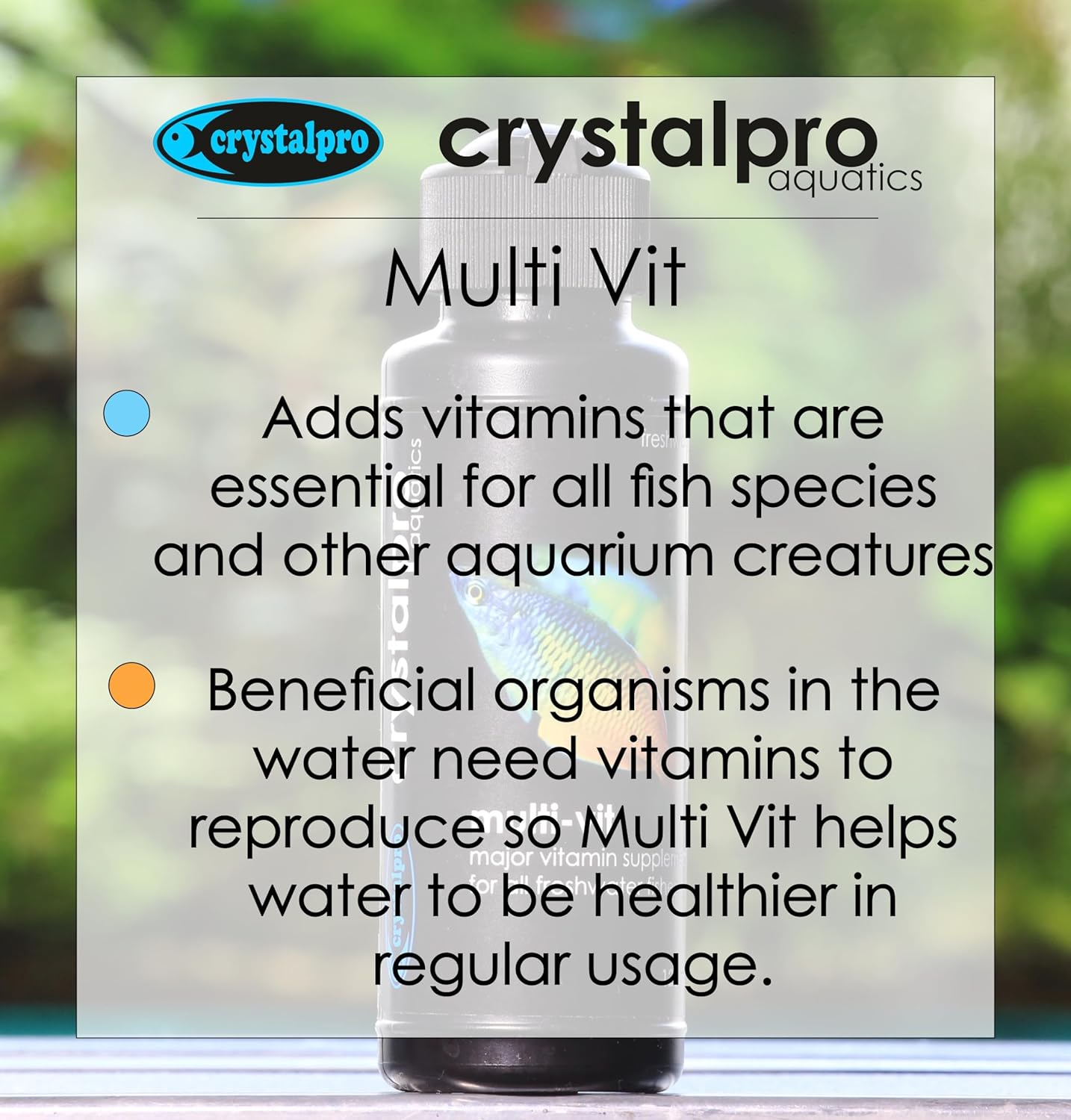 Crystalpro Multi-Vit adds essential vitamins to all fish species and other aquarium creatures they need in their metabolism. These vitamins supports healty growth. Beneficial organisms in the aquarium needs vitamins to reproduce so Multi Vit helps water to be healthier in regular usage.