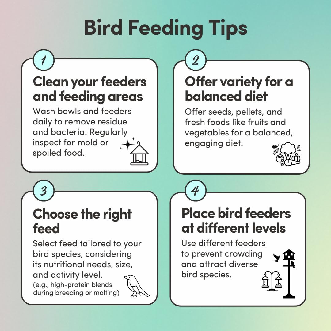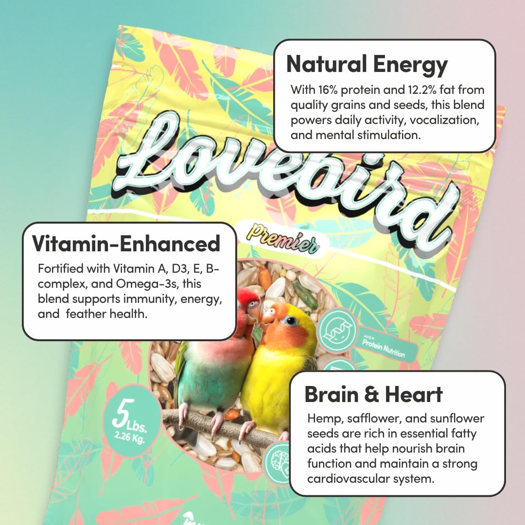Balanced Daily Blend for Lovebirds: Features millet, oat groats, safflower, and fruit powders to promote natural foraging behaviors and keep birds engaged during mealtime.