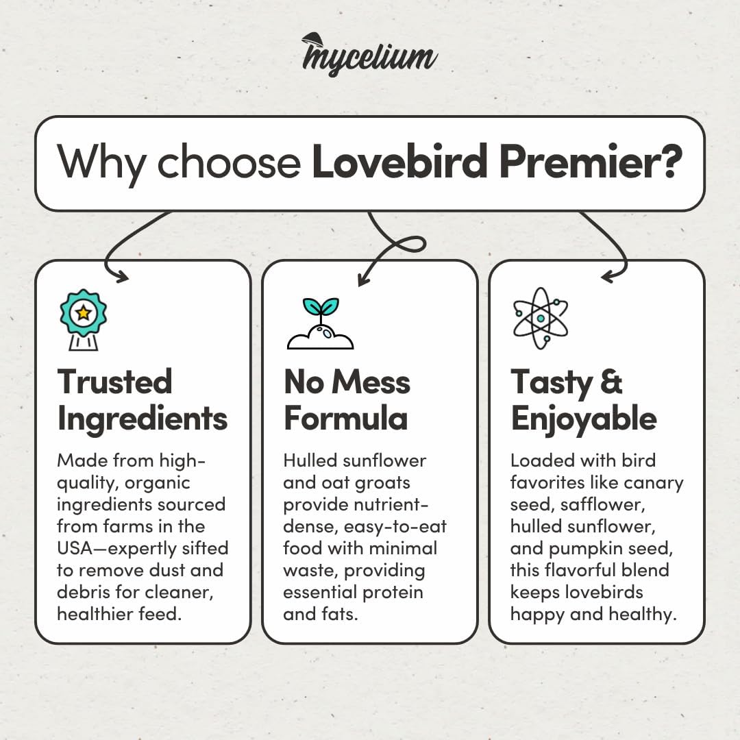 Mycelium Organic Lovebird Premier Feed (5 LBS) | Premium Bird Food for Lovebirds & Small Parrots | High-Protein, Vitamin-Fortified Daily Nutrition | Supports Brain & Heart Health | USA Made, Non-GMO