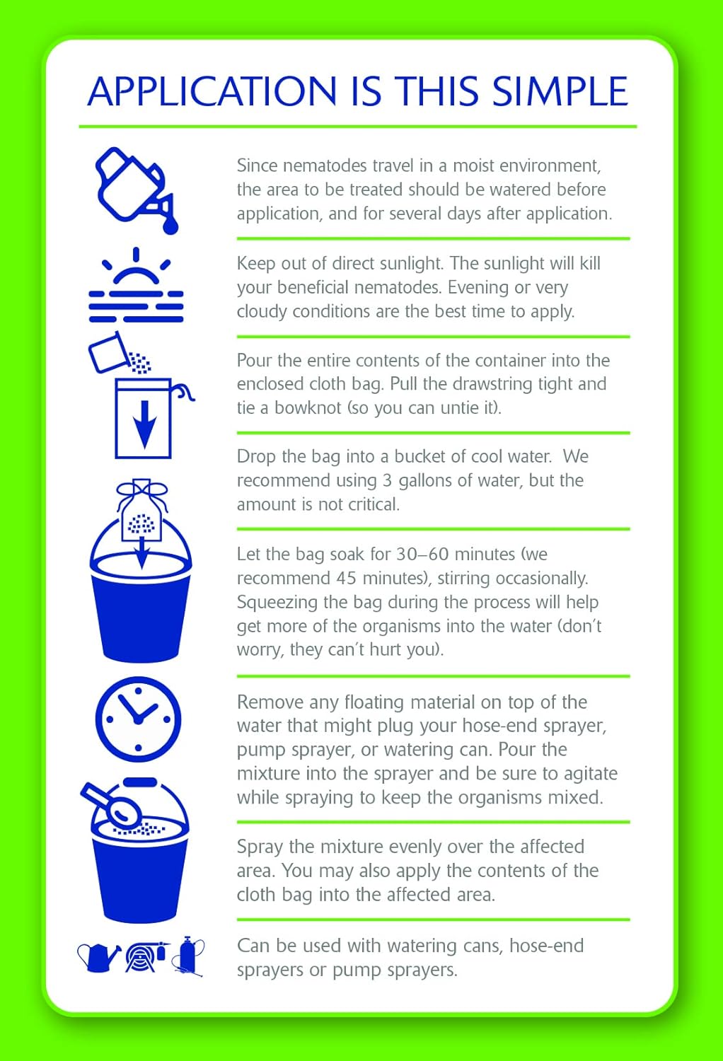 FOR BEST RESULTS: Keep out of direct sunlight. Sunlight will attack nematodes before they sink into the soil and ground cover. Apply at dusk for best results. Since nematodes travel best in a moist environment, water the area to be treated before, and once a day for 2-3 days after application.