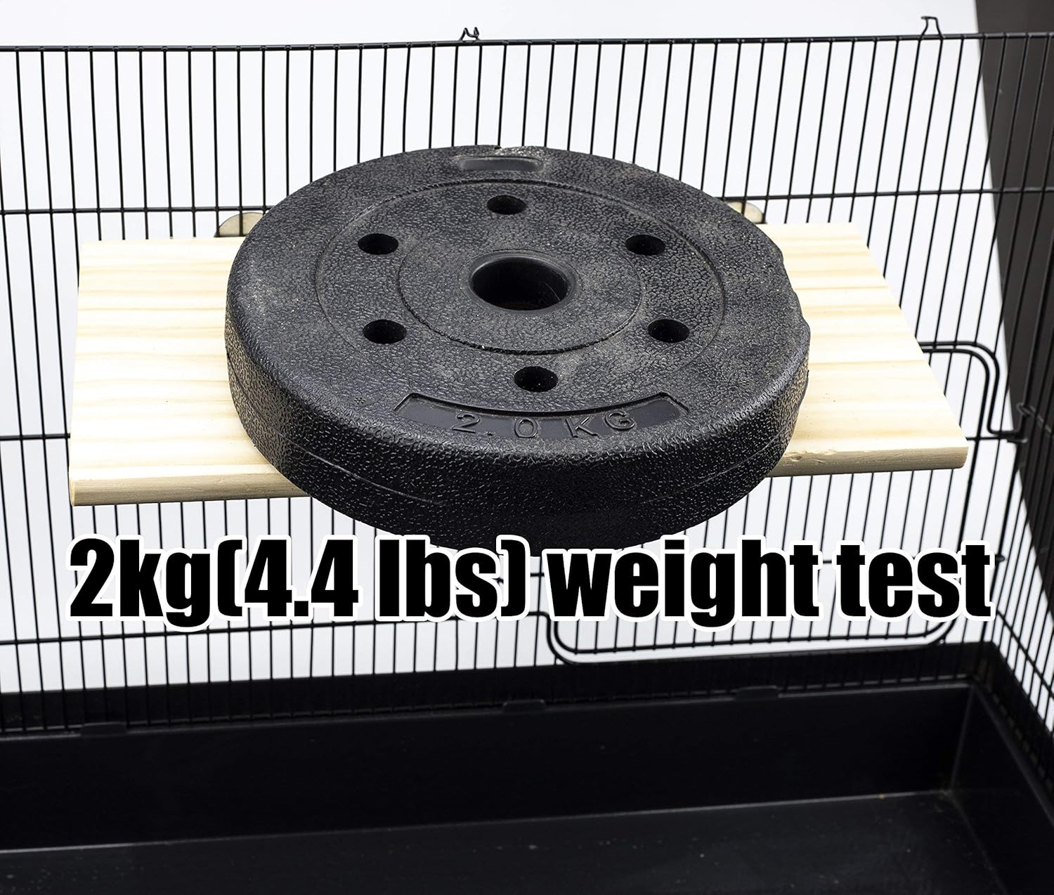 First of all it came broken. The screw that goes into the board had completely come out. Thankfully the hole wasnât stripped so I was able to screw in back in by hand. Secondly installed itâs pretty flimsy. We have a rabbit hutch with chicken wire so that may be a factor however my one year old chinchilla sits on it and it bows downward. Our six month old chinchilla sits on it just fine. So wouldnât recommend for any pet bigger than a rat.