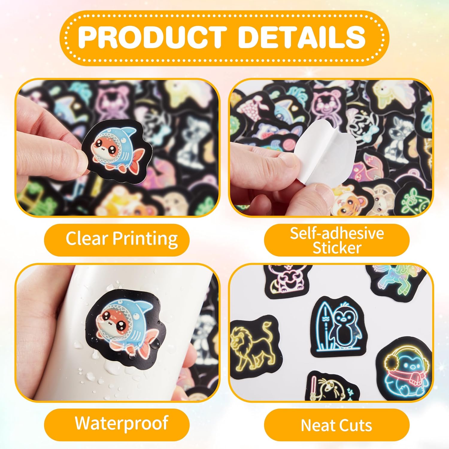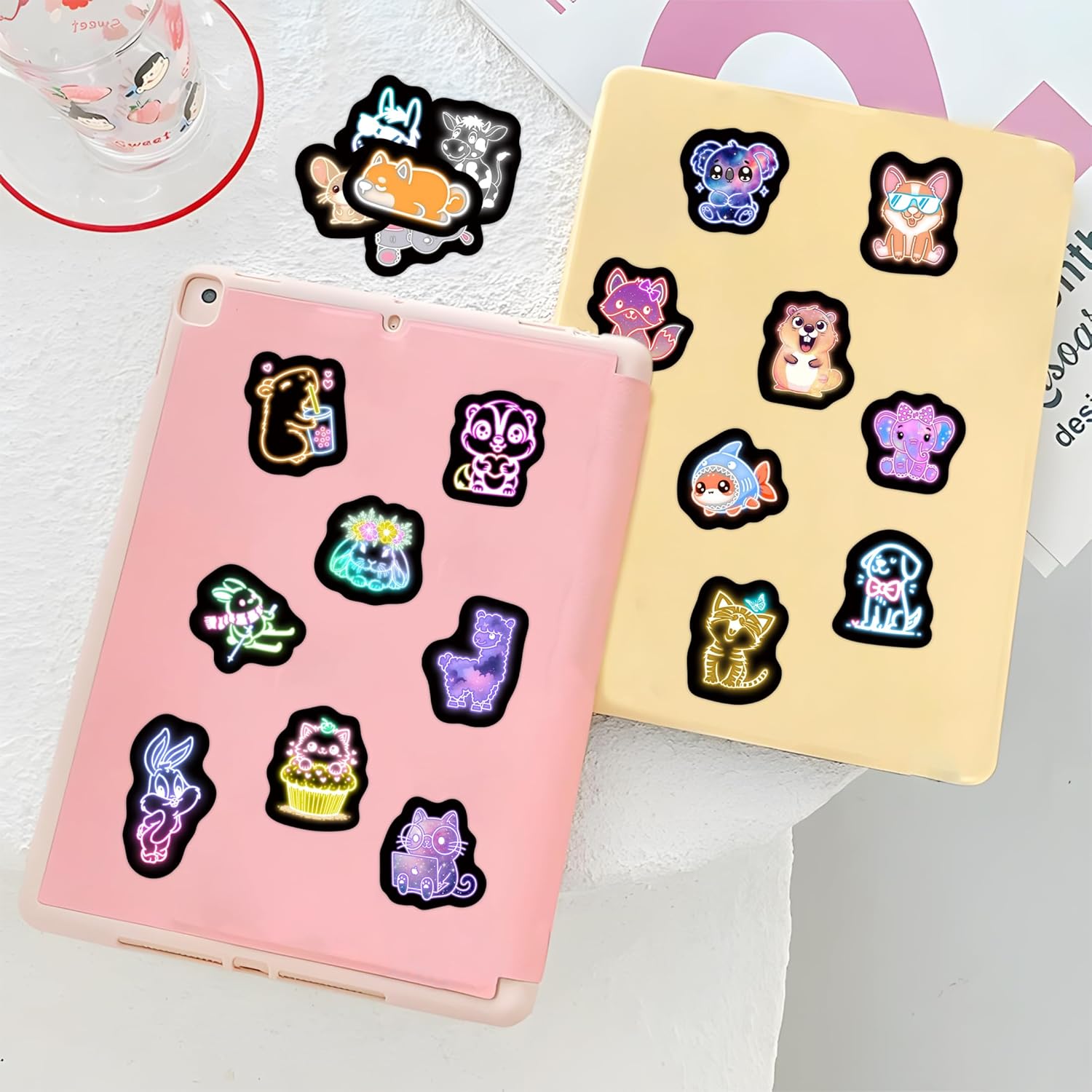 Neon Animal Water Bottle Stickers for Kids, 70 Pcs Cartoon Cute Vinyl Laptop Decals, Teens Girls Boys Adults Phone Case Skateboard Luggage Decor