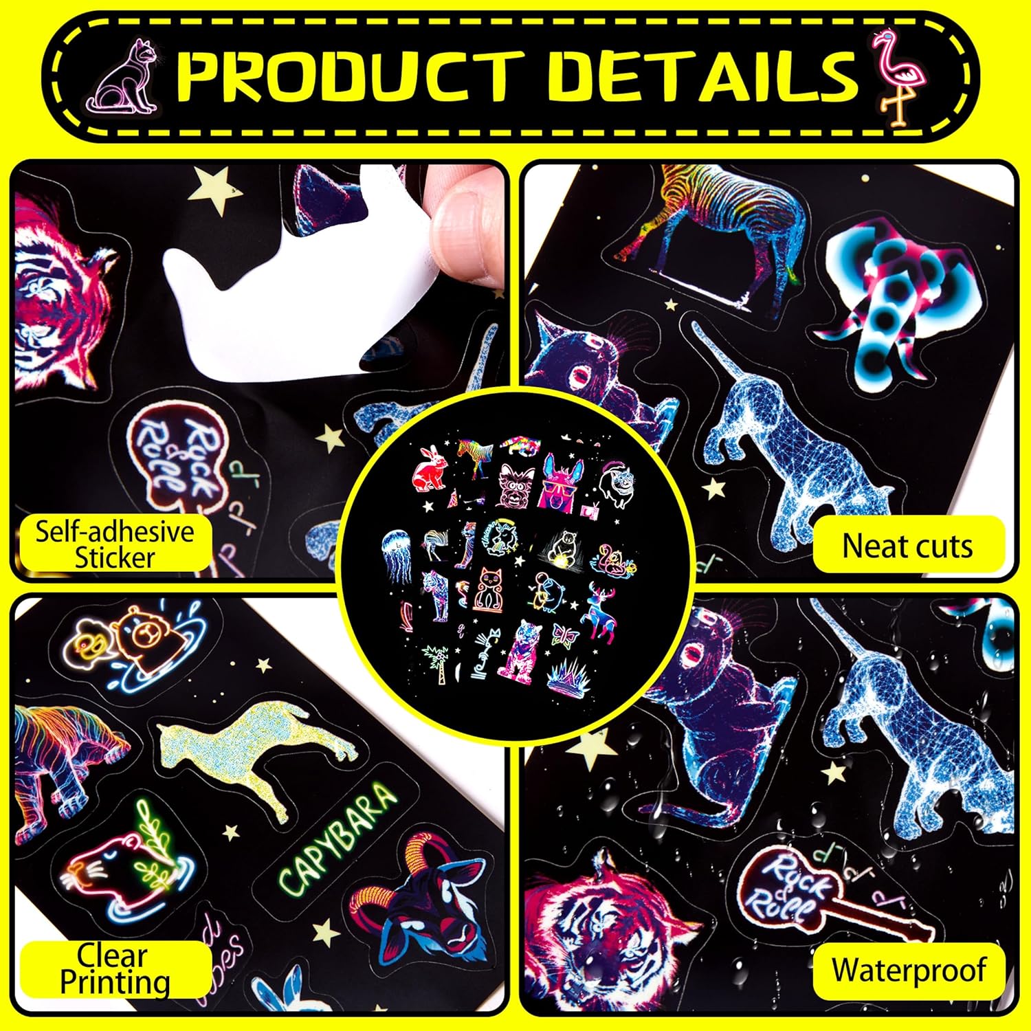 Product Summary: Neon Water Bottle Stickers for Kids, 63 PCS Vinyl Waterproof Stickers Pack for Laptop Skateboard Phone Case, Cute Neon Animals Decals for Teens