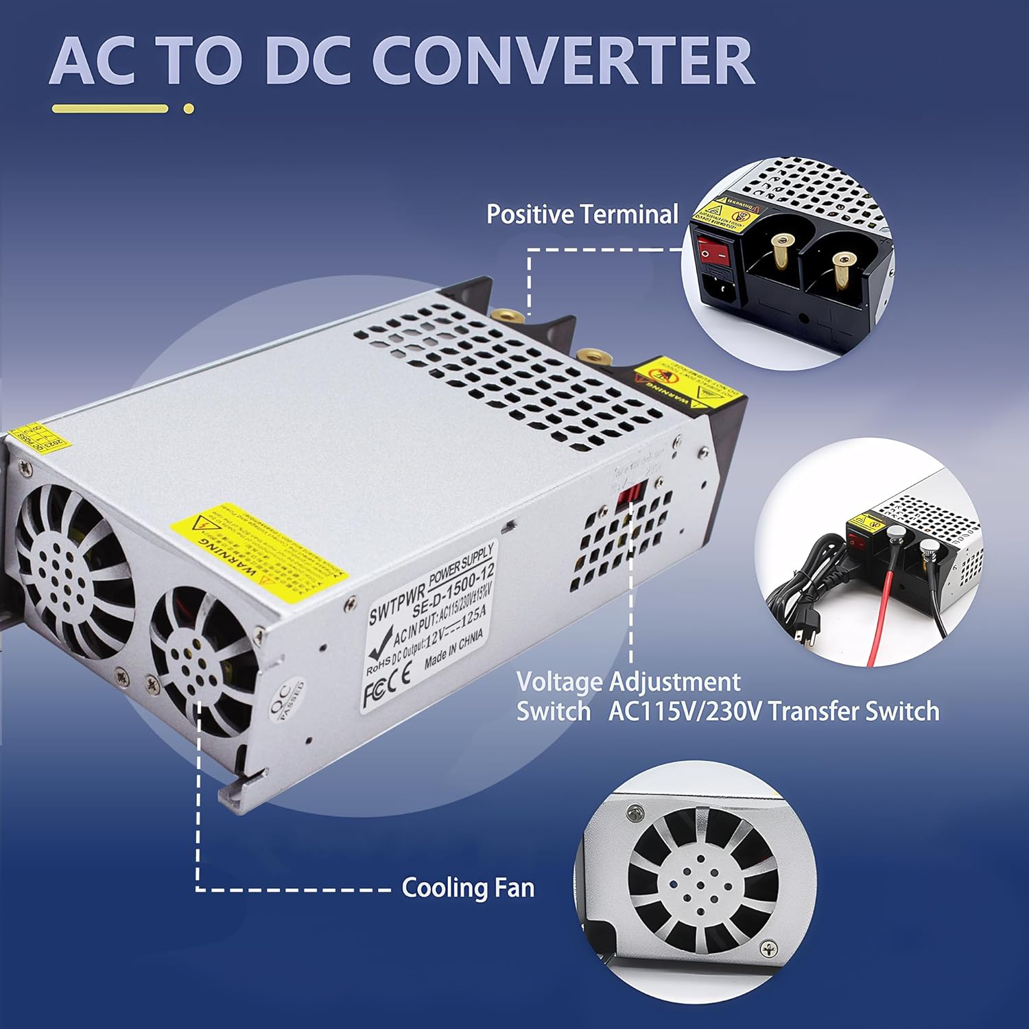 New Upgraded DIY SMPS 110V AC to DC 12V 125A 1500W Power Supply,12V DC Power Supply,110V to 12V Converter Voltage Transformer for Motor Pump CCTV 3D Printer Air Compressor Led (12V-125A-1500W, 12V)