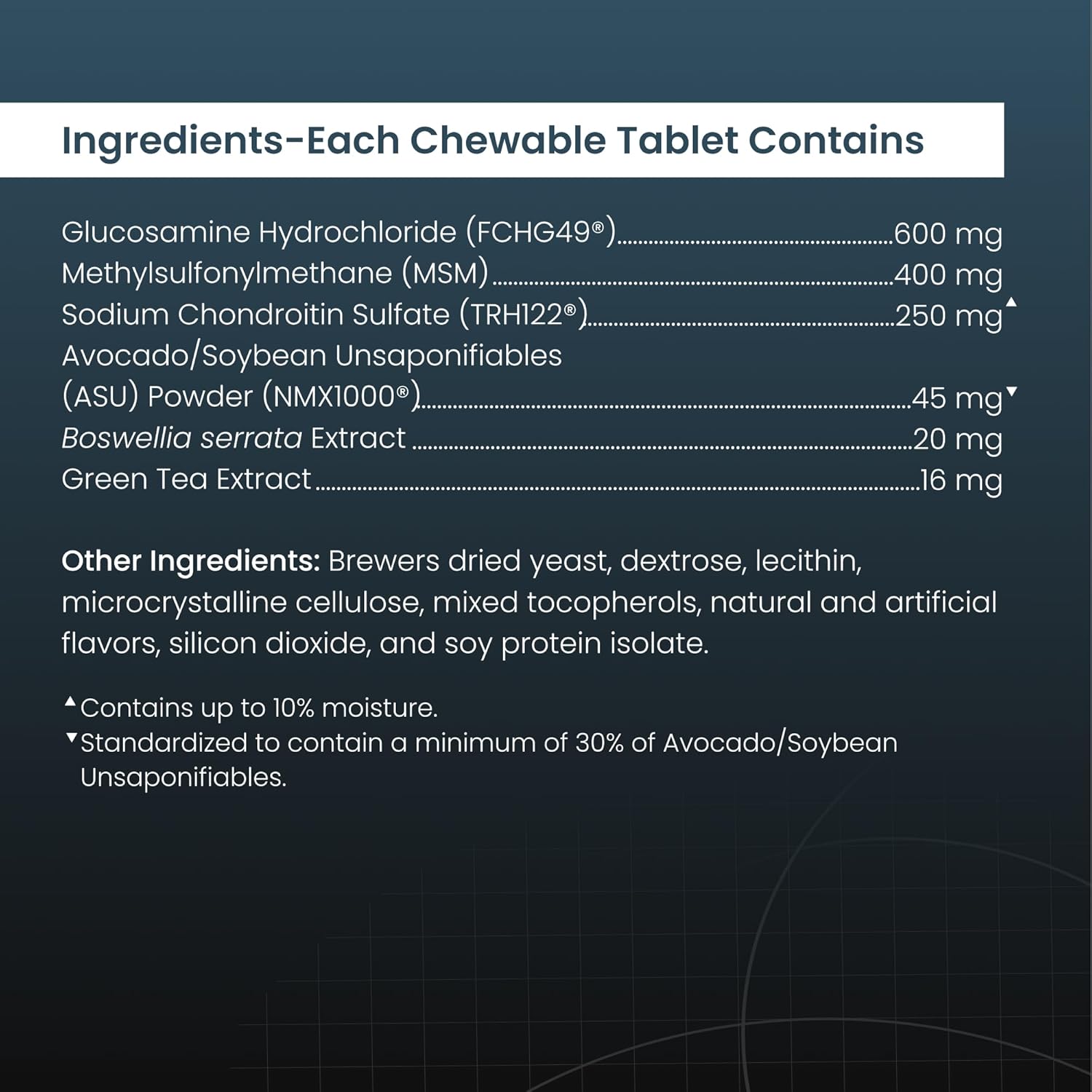 Dasuquin is the number one veterinarian recommended joint health brand that goes beyond standard glucosamine supplements. Dasuquin combines NMX1000 ASU(avocado/soybean unsaponifiables) and decaffeinated tea with Glucosamine and sodium chondroitin sulfate to provide a comprehensive joint health formula. MSM (methylsulfonylmethane), a source of sulfur used to support cartilage, adds to the multi-prong approach to joint health support. Research has shown that its specific glucosamine hydrochloride and low molecular weight chondroitin sulfate have demonstrated synergy in stimulating cartilage matrix production, while ASU also acts synergistically with glucosamine and chondroitin sulfate. Dasuquin with MSM chewable tablets provide a tasty and convenient option for supporting your dog’s joint health!” Source: Among veterinary brands. Survey conducted among small animal veterinarians who recommended oral joint health supplements brands in US.