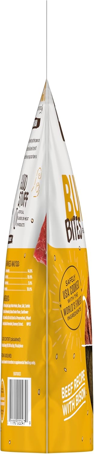 Bring the backyard BBQ to your dog’s treat time with Rachael Ray Nutrish Burger Bites Dog Treats, Beef Recipe With Bison. Made with real U.S. farm-raised beef as the #1 ingredient, these soft, chewy treats deliver the mouthwatering flavor of a juicy burger your dog will love. The added bison gives each bite a bold, protein-packed twist that keeps tails wagging. These grain-free dog treats contain no artificial flavors, meat by-products, or added grain ingredients, so you can feel confident giving your pup a high-quality snack. Their soft texture makes them easy to chew and break apart, making them perfect for dogs of all sizes. Every batch is safely cooked in the USA using the world’s finest ingredients, ensuring both quality and taste in every pouch. Whether you’re training, rewarding good behavior, or just sharing a moment, these burger-inspired bites are sure to become a favorite.