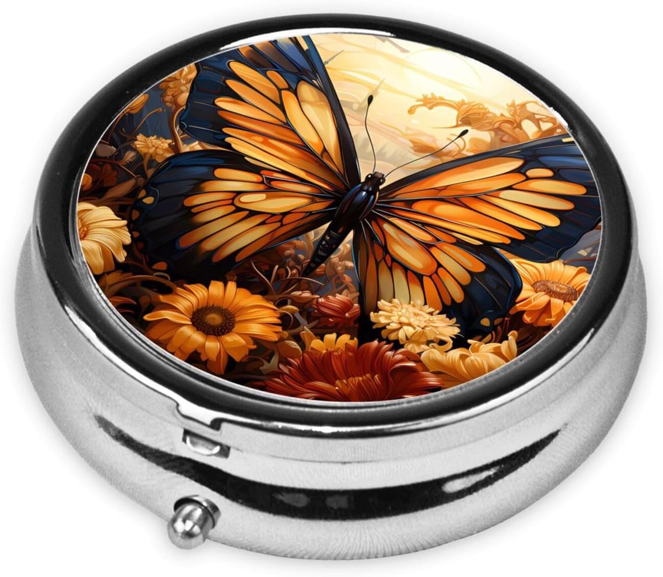 orange yellow butterfly field flowers Stay organized and stylish with this Round Pill Box – a portable medicine storage container perfect for vitamins, supplements, fish oil, and more. Designed with a full-print exterior, this pill box is not just functional but also a fashionable addition to your daily routine. Made from durable electroplated metal iron, it offers a premium feel and long-lasting performance.