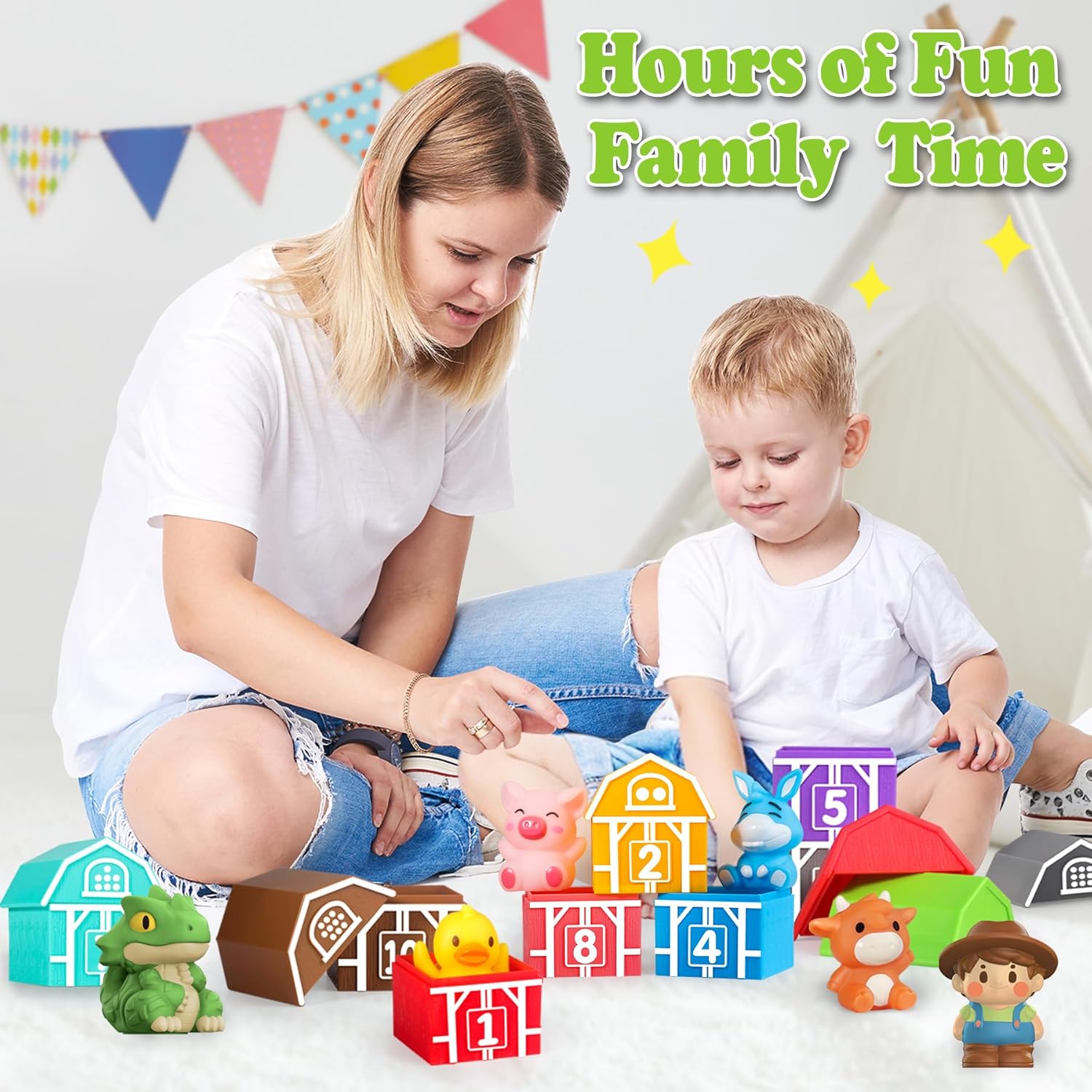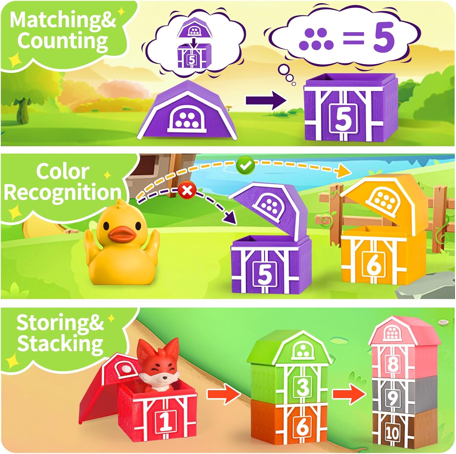 【Montessori Toys for Babies】These toddler learning toys 1-3 Each farm animal has cute shape and barn has different numbers, is exclusively designed for baby to recognize and learn early math. Bright colors are visually stimulating and spark kid’s imagination