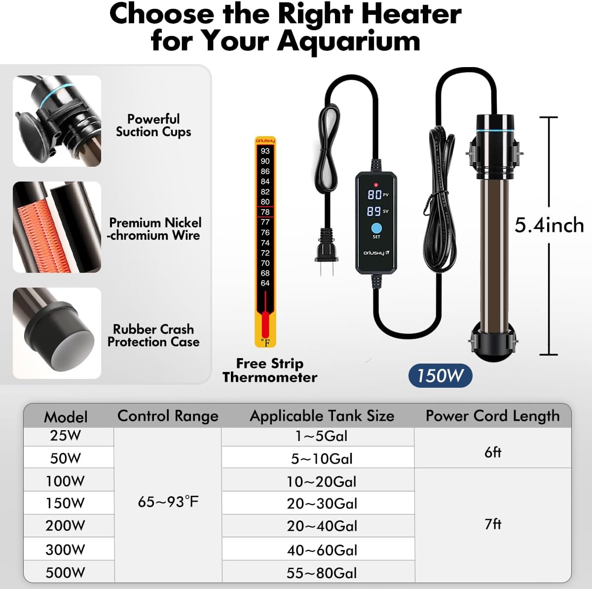 Orlushy 150W Aquarium Heater: Orlushy 150W heater can work perfectly in 20-30 gallons tank, suitable for aquariums, fish tanks, betta tanks and turtle tanks. The length of this heater is 5.4 inches, which is more compact in size than original heater, taking up less space and can be easily hidden in the aquarium.