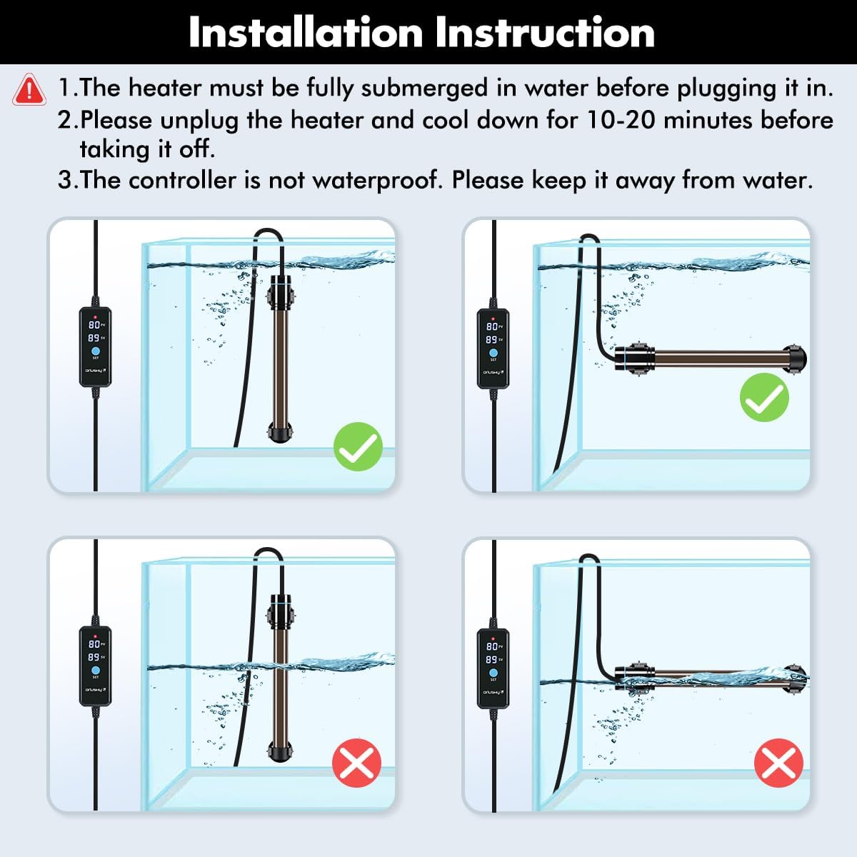 Rapid Water Heating and Accurate Water Sensor: With uniformly wound premium nickel-chromium wire, heat can rapidly dissipate to a wider area in water, more efficient water heating. Unique water temp sensing system can accurately correct the water temperature in real time at set value, protecting your aquatic lives from fluctuating water temperature. Once the water temperature exceeds 95℉, heater will automatically cut off the power and error code “EE” will be shown, getting your fish rid of the risk of “boiling fish”.