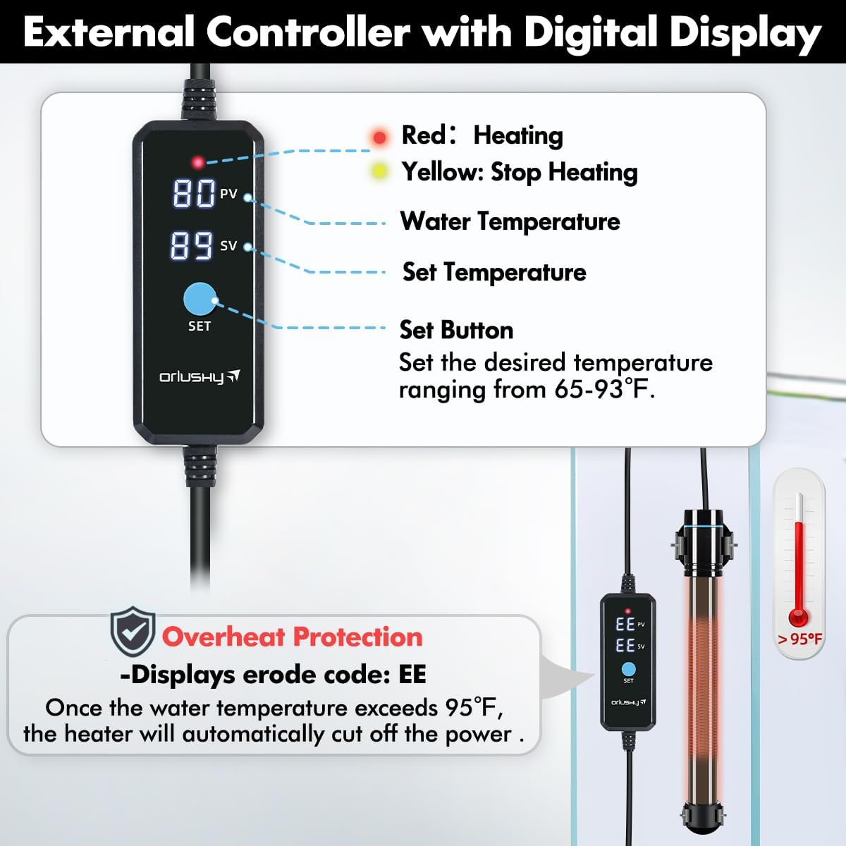 Orlushy 150W Submersible Aquarium Heater, Adjustable Fish Tank Heater with Digital Display External Controller, Overheat Protection and Free Thermometer for 20-30 Gallons Freshwater and Saltwater Tank