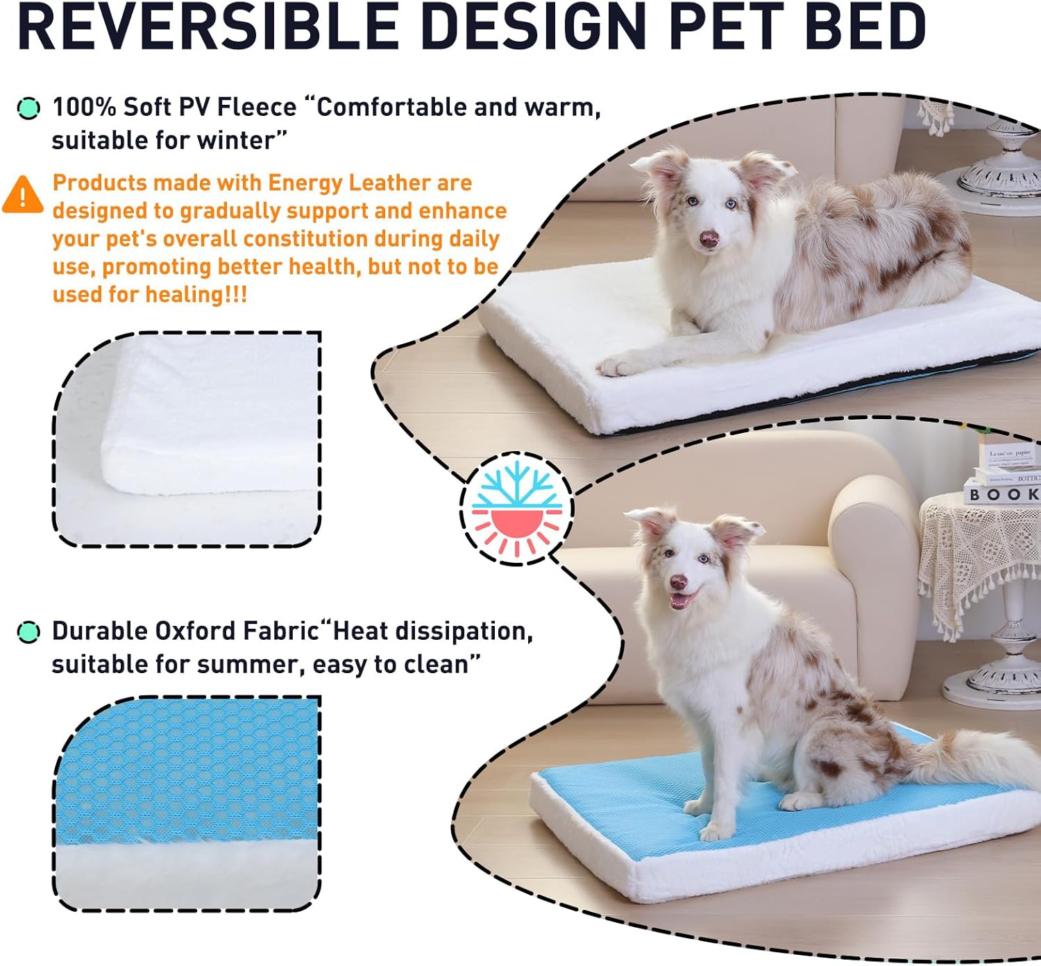 Dual-Sided Inner Cushion for Optimal Comfort: This orthopedic dog bed features a unique dual-sided inner cushion that caters to your pet’s comfort needs. One side is designed to be a cooling bed for dogs and the other side is made of soft PV fleece with an energy boosting layer. This innovative design promotes your dog’s overall health and well-being, making it an ideal choice for a memory foam dog bed. Whether your pet prefers a cooler surface or a plush feel, this dog cooling mat indoor adapts to their preferences, ensuring a restful sleep for both medium and large dogs