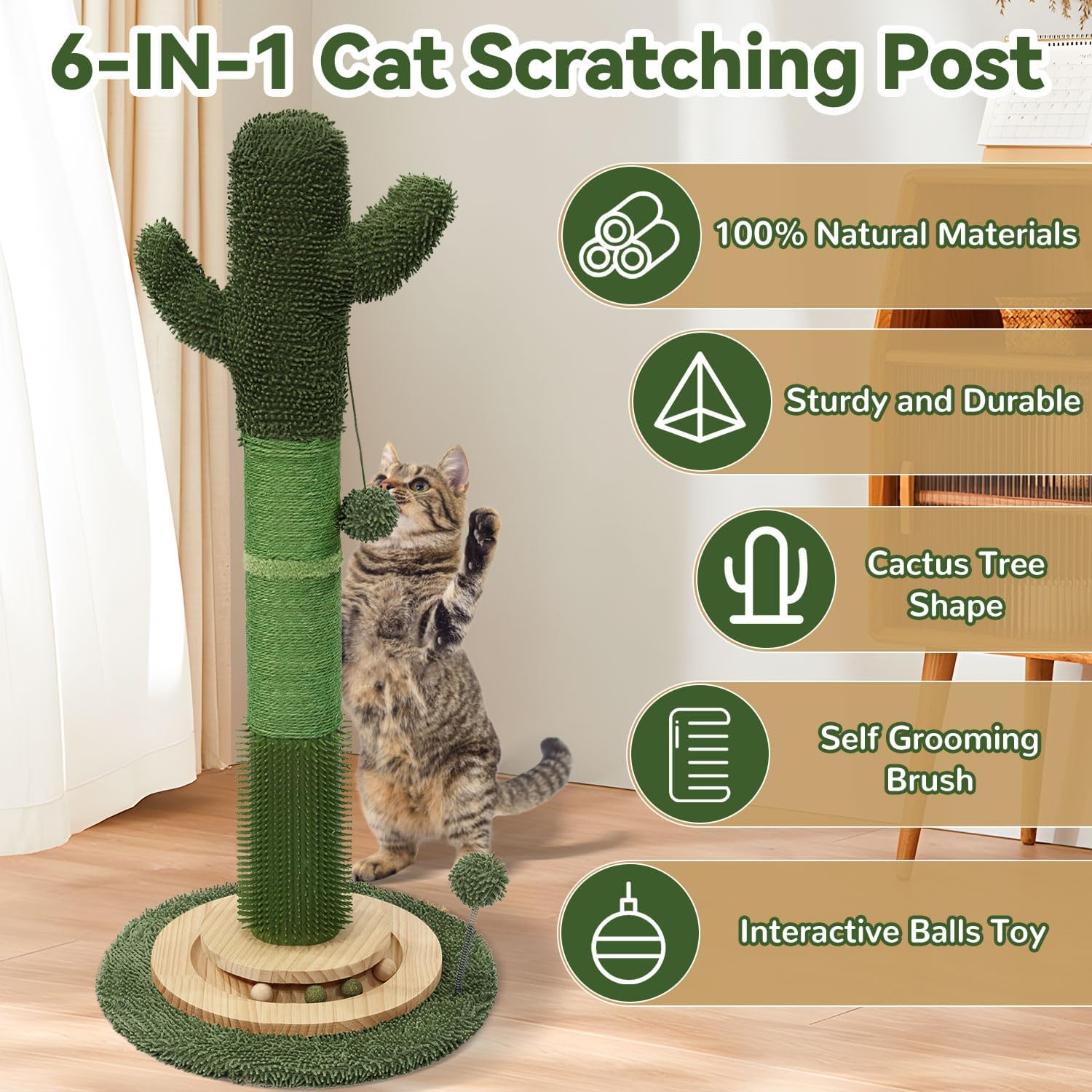 OTOB 36″ Tall Cat Scratching Post, Natural Sisal Rope Cactus Cat Scratch Post, Vertical 6-in-1 Interactive Turntable Cat Scratcher Post with Soft Ball Toys, Protect Your Furniture for All Indoor Cats