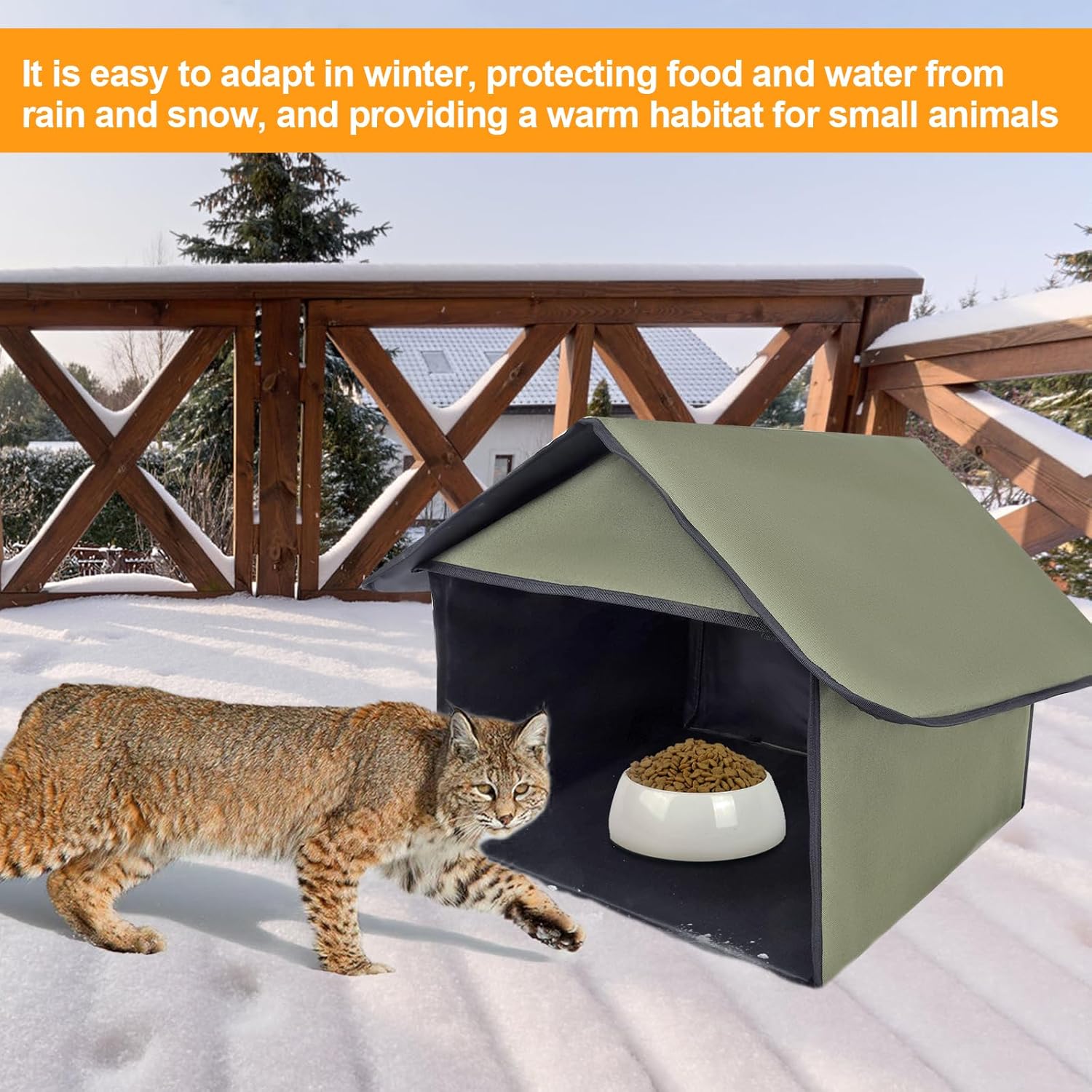 2.The green fabric outdoor cat feeding station is designed specifically for stray cats and wildcats. The outdoor cat feeder uses high-quality waterproof fabric materials, and the outdoor cat house weatherproof ensures a dry and clean dining environment for cats in various weather conditions. The sloping roof design effectively prevents rainwater, snow, and debris from entering, keeping food and water clean. No tools required, easily assembled within minutes, suitable for placement in outdoor spaces such as courtyards, balconies, or porches. Cat outdoor shelter: Whether it’s the cold winter or the hot summer, this feeding station can provide a safe and comfortable dining place for your cat friends