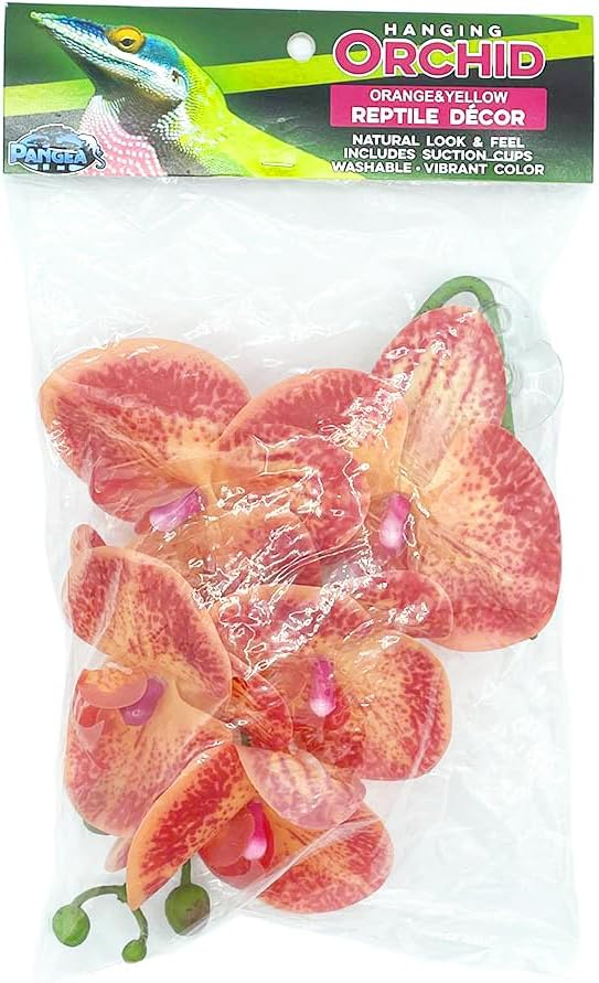 Pangea Hanging Orchids is a beautiful decoration that can go in any terrarium. They are made of non-toxic plastic, and the best part is that you don’t need to water them! They are easy to hang with 2 small suction cups that stick to clean glass or plastic. The vine is bendable so you can adjust it to fit your scenery exactly how you like it! The 13″ long Orchids are made of non-toxic plastic. This makes the plants easy to clean whenever it’s time to clean up. Since it is non-toxic you can be sure it is safe for your animal.