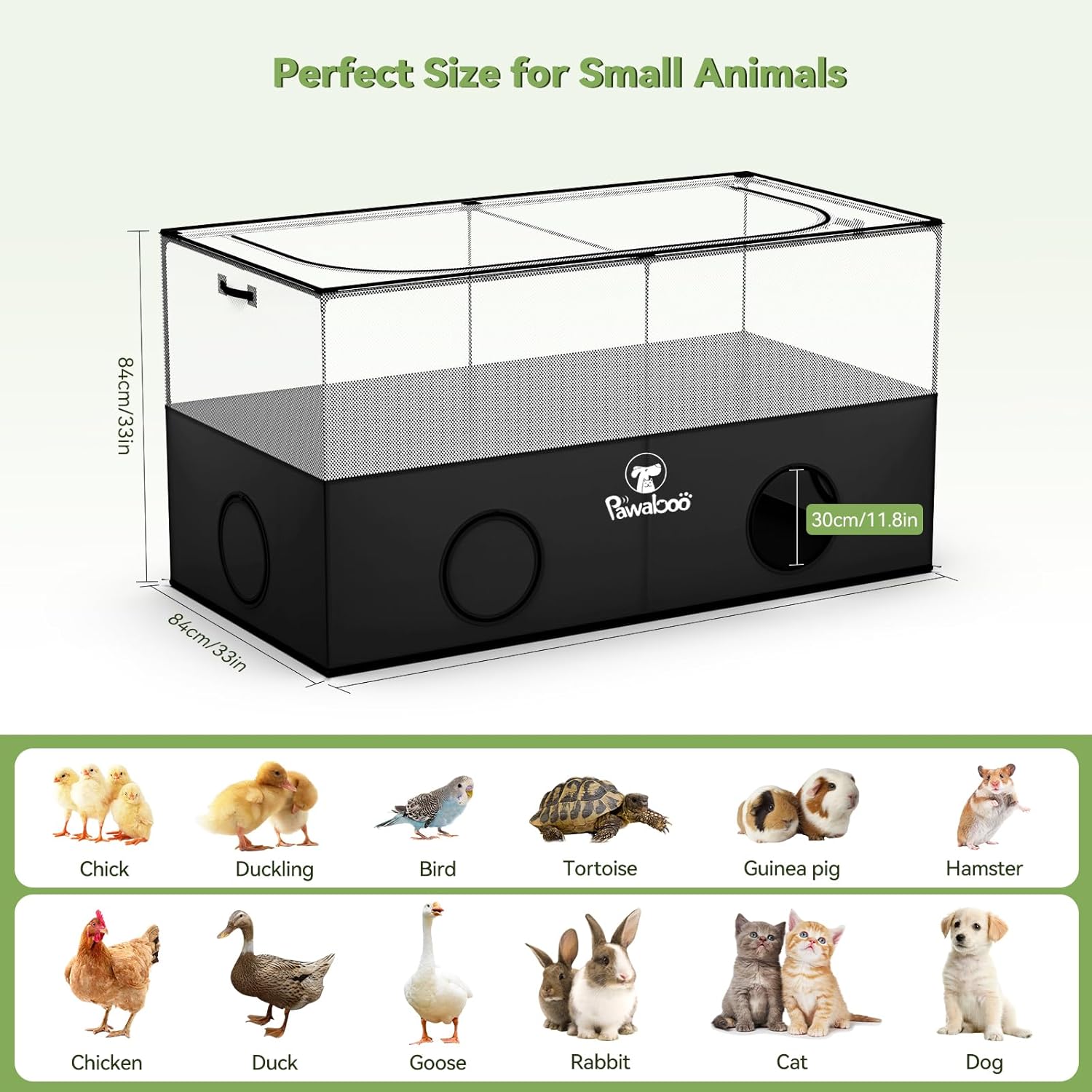 Designed for Small Animals: 168cm * 84cm * 84cm/66.14in * 33.07in * 33.07in small pet cage, perfect to as chick brooder, pet enclosure for guinea pig, rabbit, puppy, kitten. The left and right side of the enclosure are designed with fabric strap handles, making it easier to move the enclosure